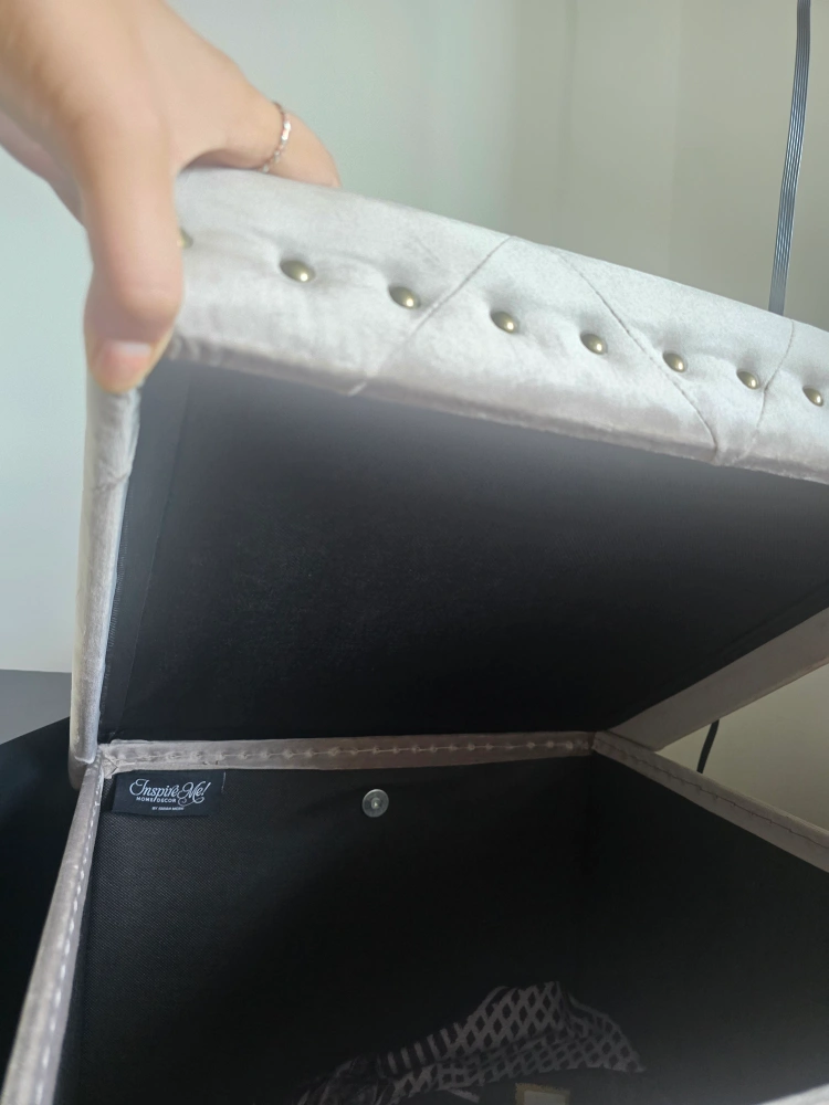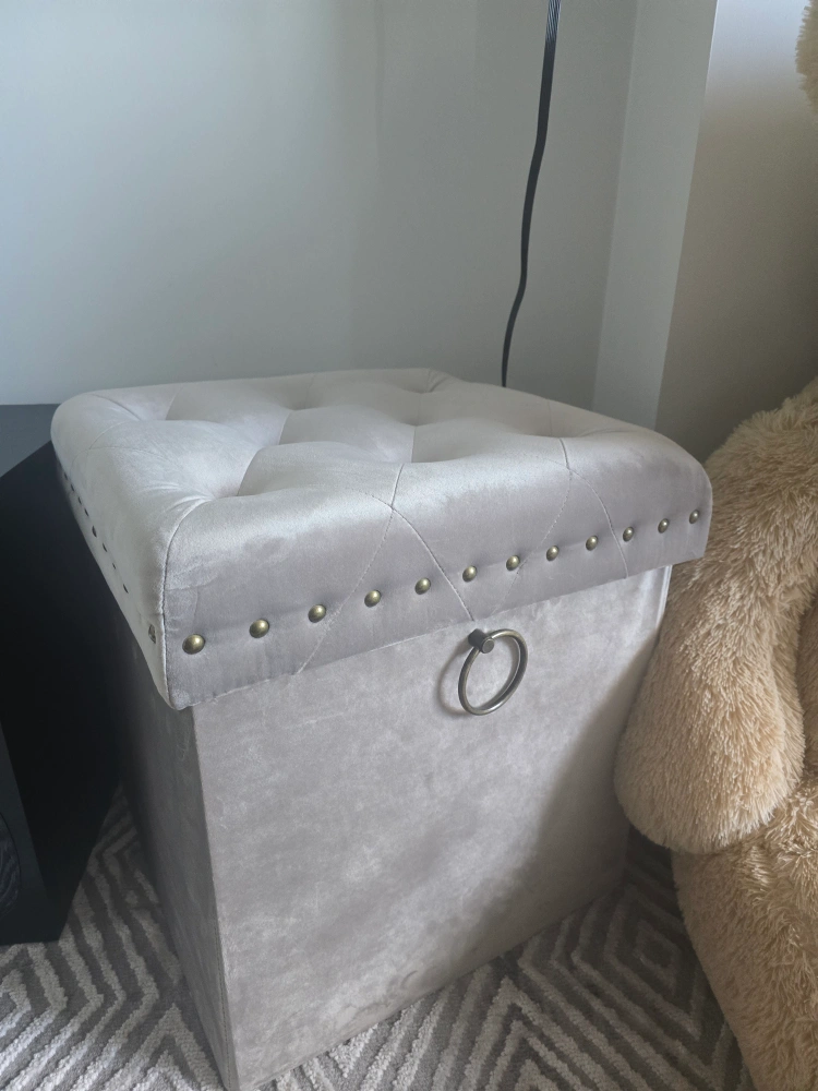 Square ottoman. Features a cushioned top with tufted accents. A metal ring for a handle. Interior space for storage. A great piece for the living room, to keep things tidy.