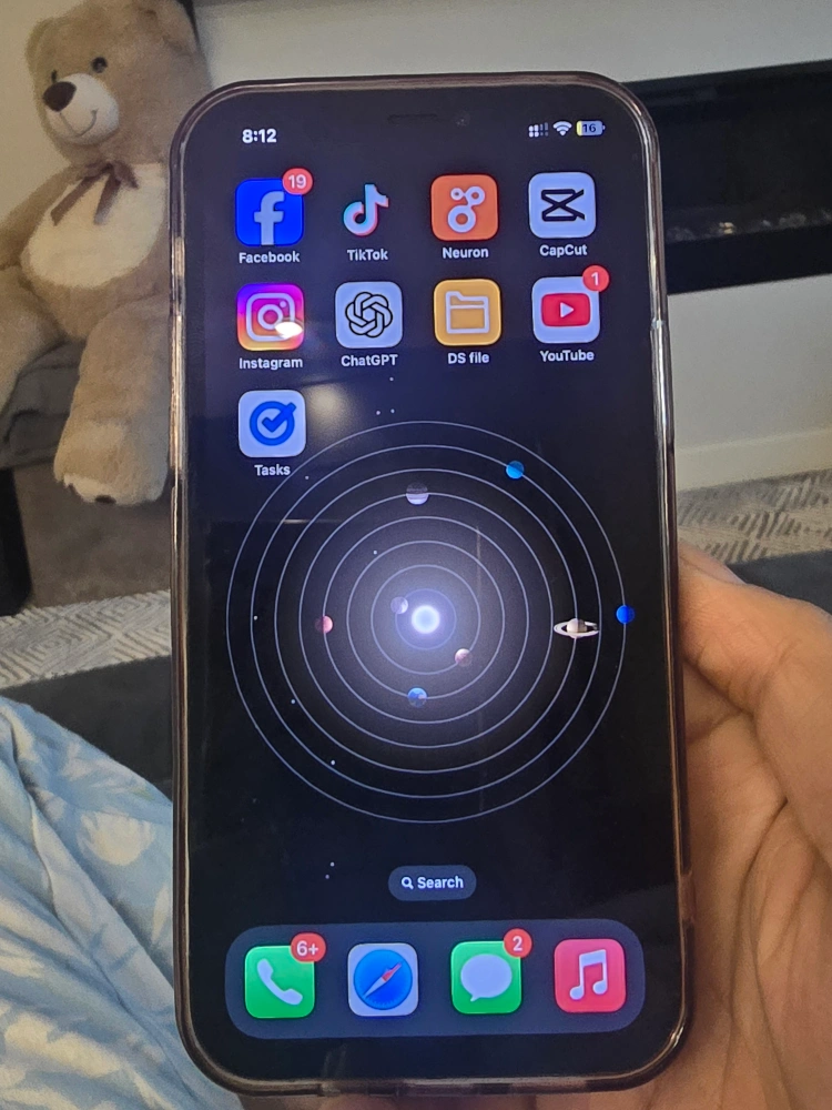 A used iPhone. Comes with a clear case. Features a sleek design with a glass back. A great device to stay connected to the world, while still having the time to relax and enjoy the present moment.