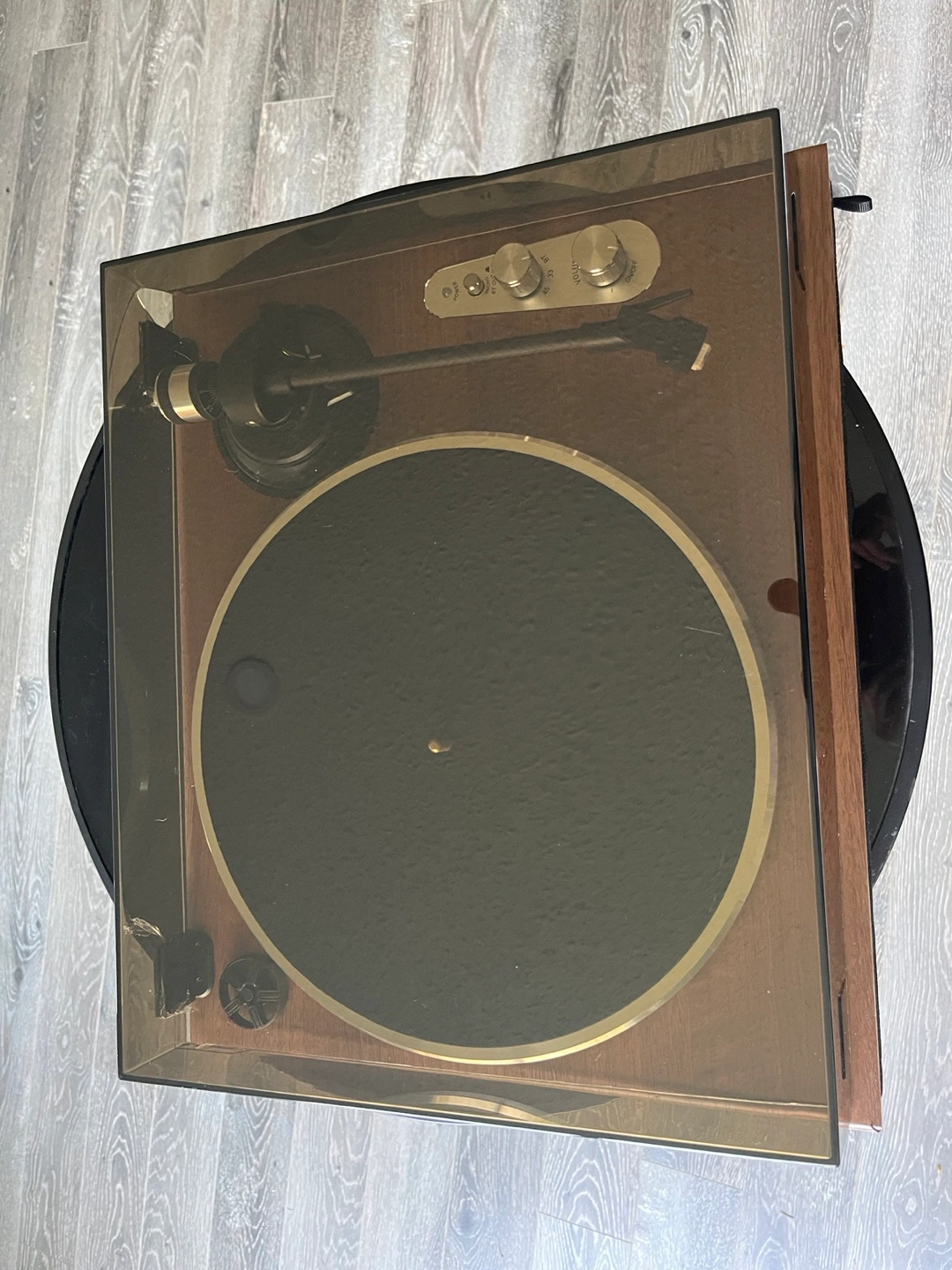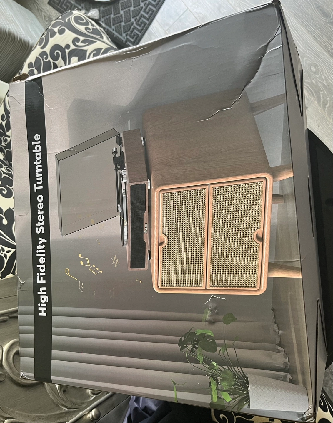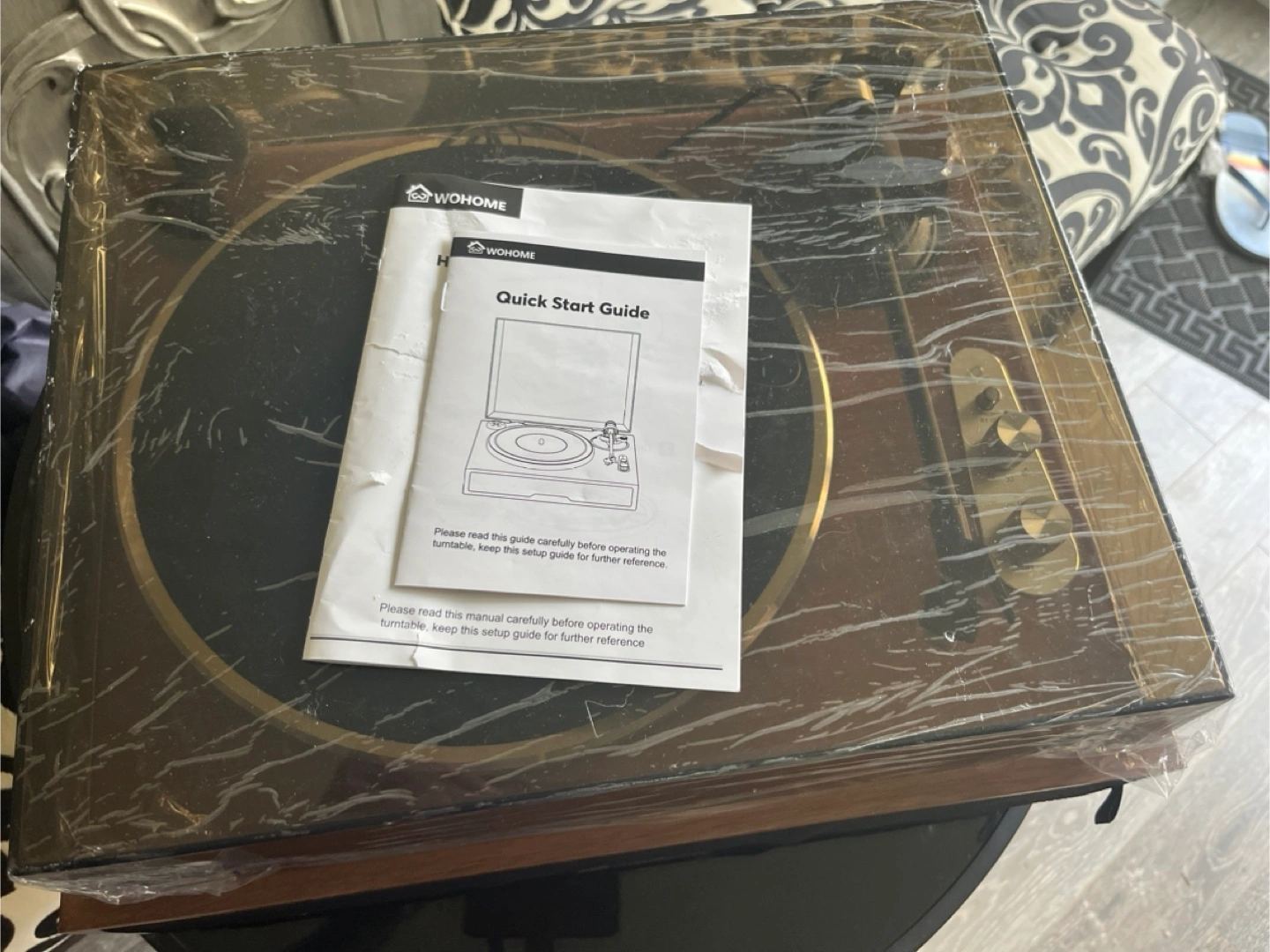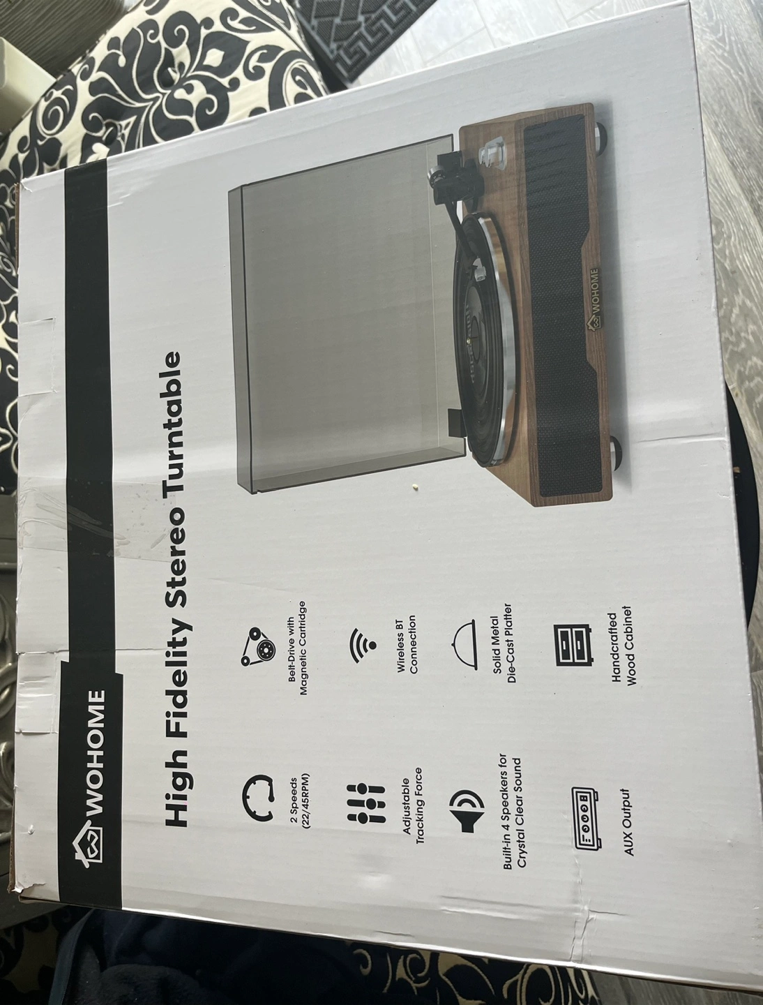 WoHome Vinyl Records turntable player Built in speakers External audio facility BLUETOOTH in out Magnetic Cartridge 2 Speed Metal Platter Adjustable Counterweight NEW IN OPEN BOX Note : There is a small chip damage on the rear side of the cover.