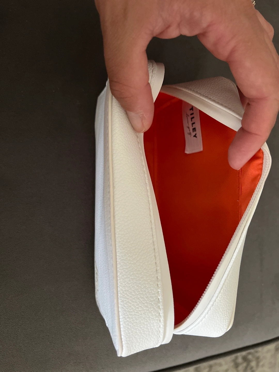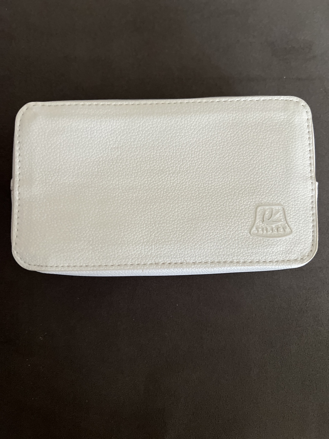 Here's a cute Tilley cosmetic bag in white! It's in great condition and ready for a new home! It has an orange interior.