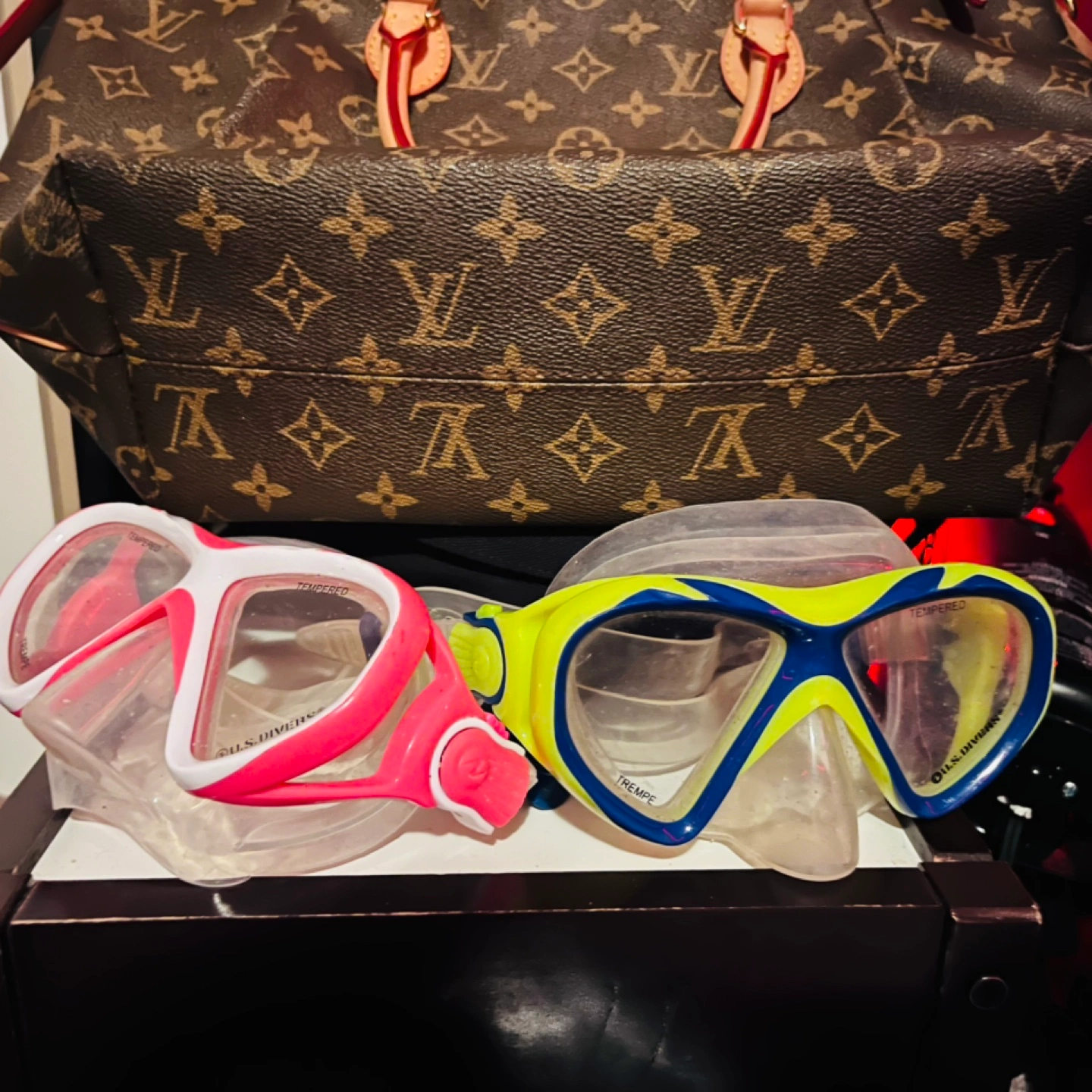 Two diving masks. One mask is a vibrant pink and white. The other is a bold yellow and blue. Diving masks are the perfect way to relax and enjoy the underwater world.