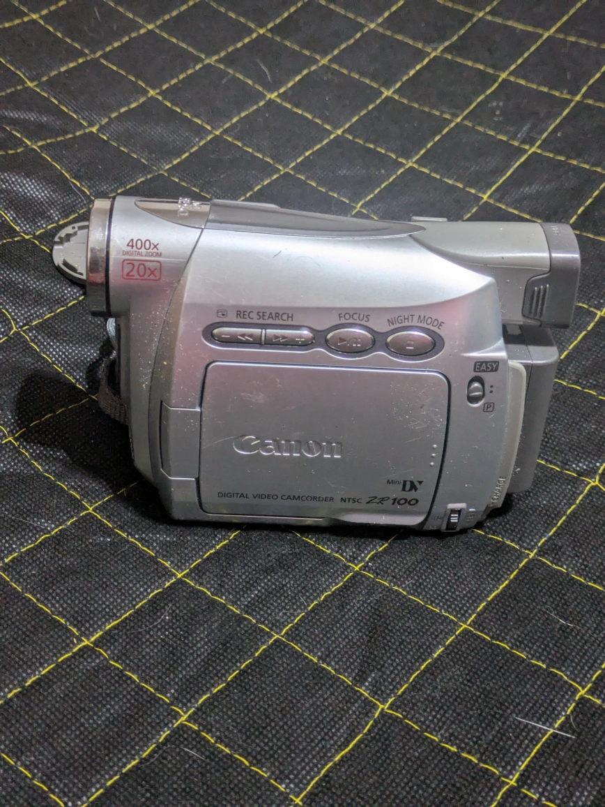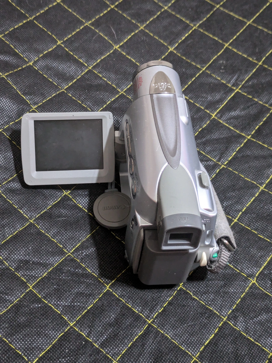 Video camera with a fold-out screen, buttons, and strap. The camera is silver. Recording memories is a great way to relive the joy in your life.