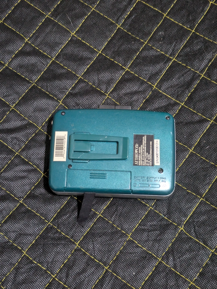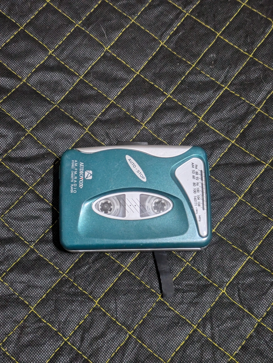 The player has a teal and silver body with buttons and a radio dial on top. The player can be opened to insert cassettes, and includes an attached belt clip. Listening to your favorite music can be a great way to unwind after a long day.