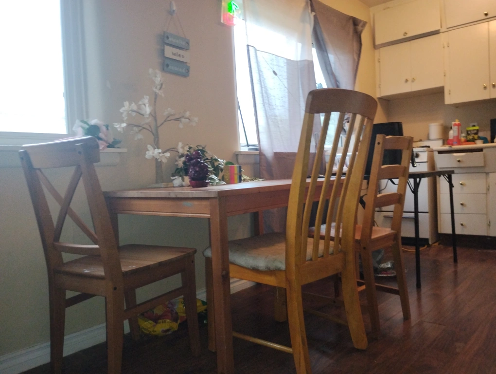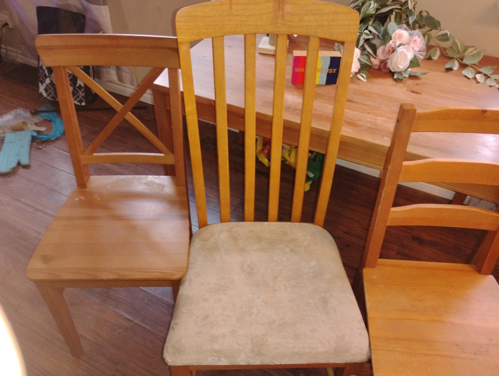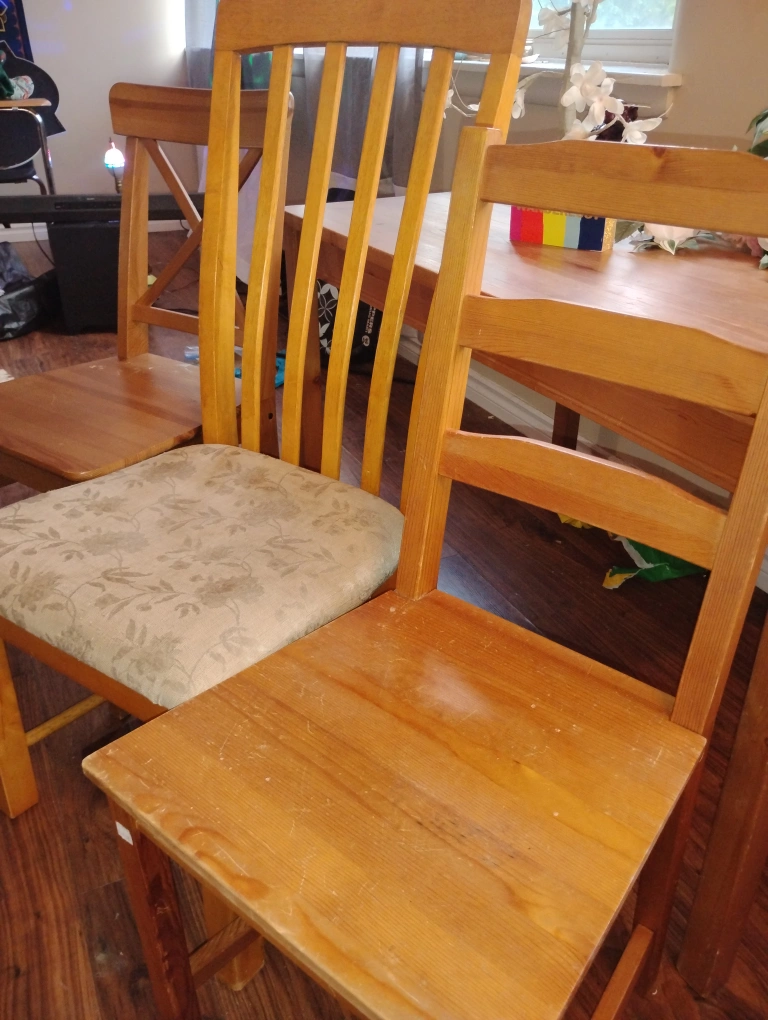 A set of wooden dining set. Varying back designs, some with cushioned seats. Perfect to add some warmth to your kitchen space. Can be a DIY project or if you just need a place to eat, lightweight. Sturdy, has been primarily a space for visitor's as opposed to being used as a dining area. Super lightweight, you just have to come pick it up. Must sell everything and willing to drop prices on all of my listings just make an offer!!!