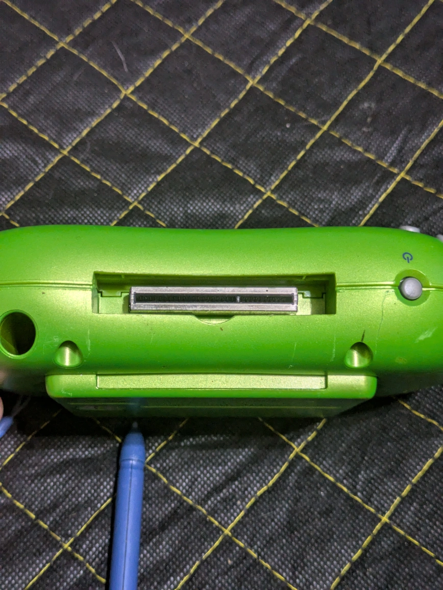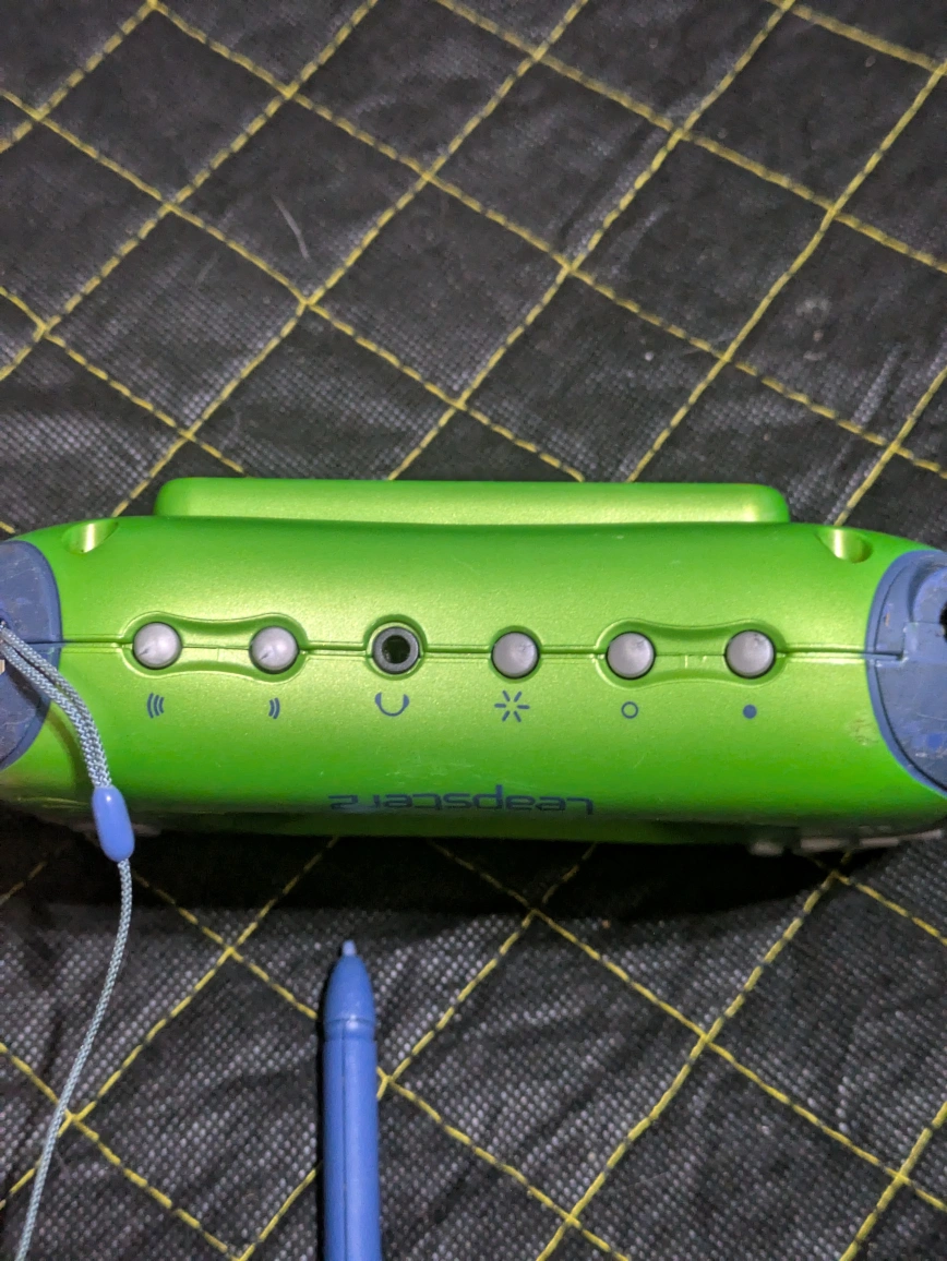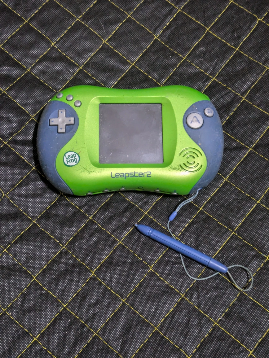 A handheld learning game with a green and blue design. It includes a stylus, and multiple buttons. A great item to keep the little ones entertained quietly.