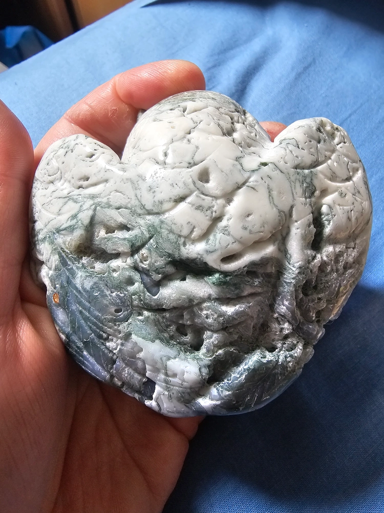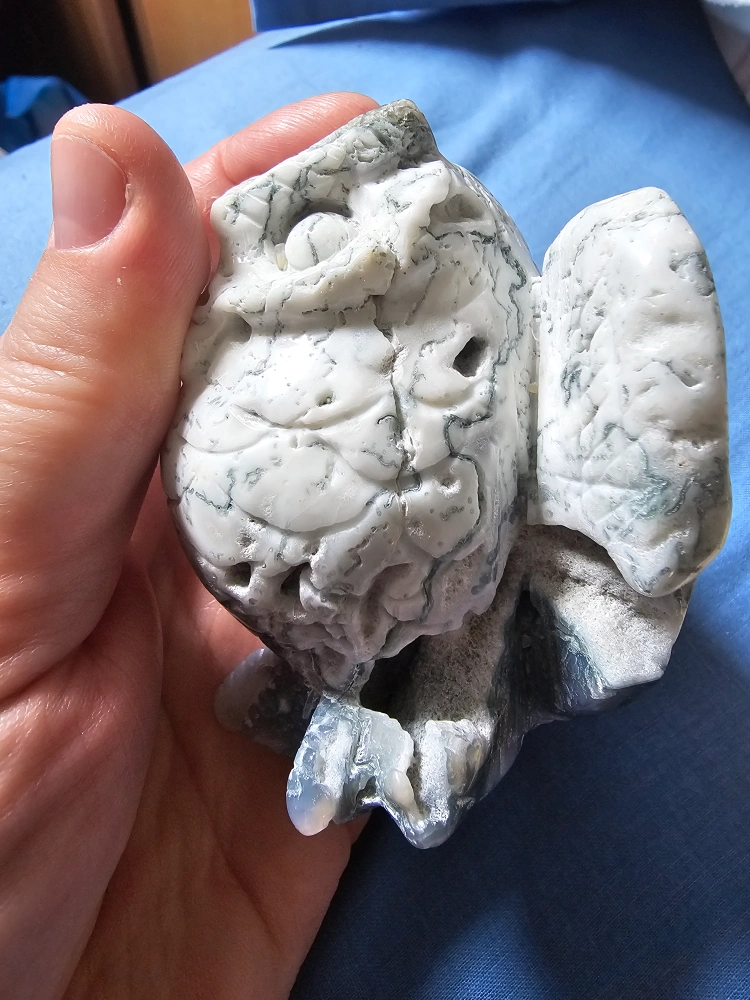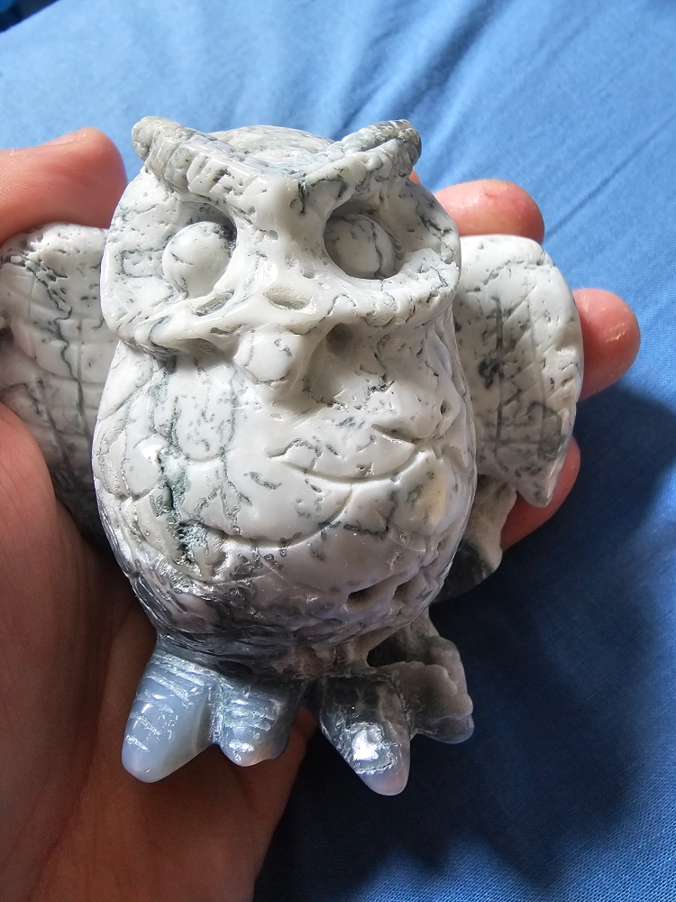 A beautifully crafted stone owl. It has green and white detailing. This is a perfect item to keep on your desk as a reminder to be mindful.