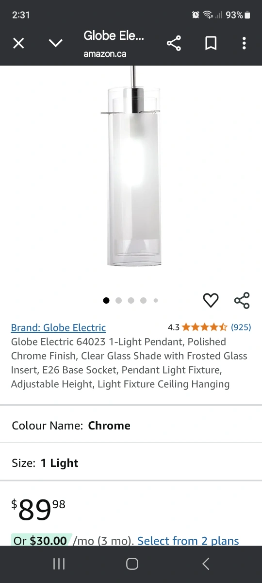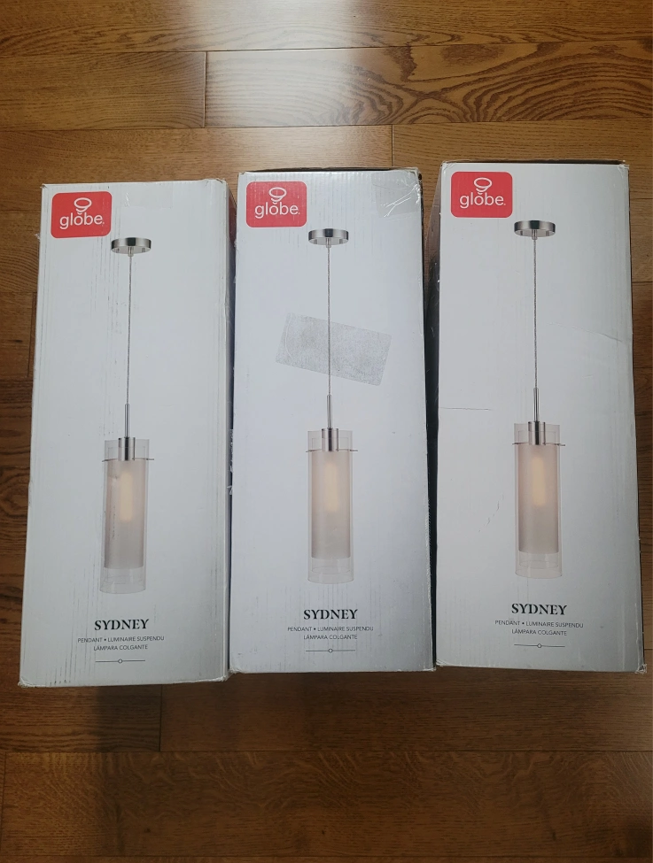 Selling three pendant lights, still in their boxes. Each light has a clear glass with frosted glass inner shade. Place them in your home to create a relaxing atmosphere. Retails $89 each , asking $75 for all 3