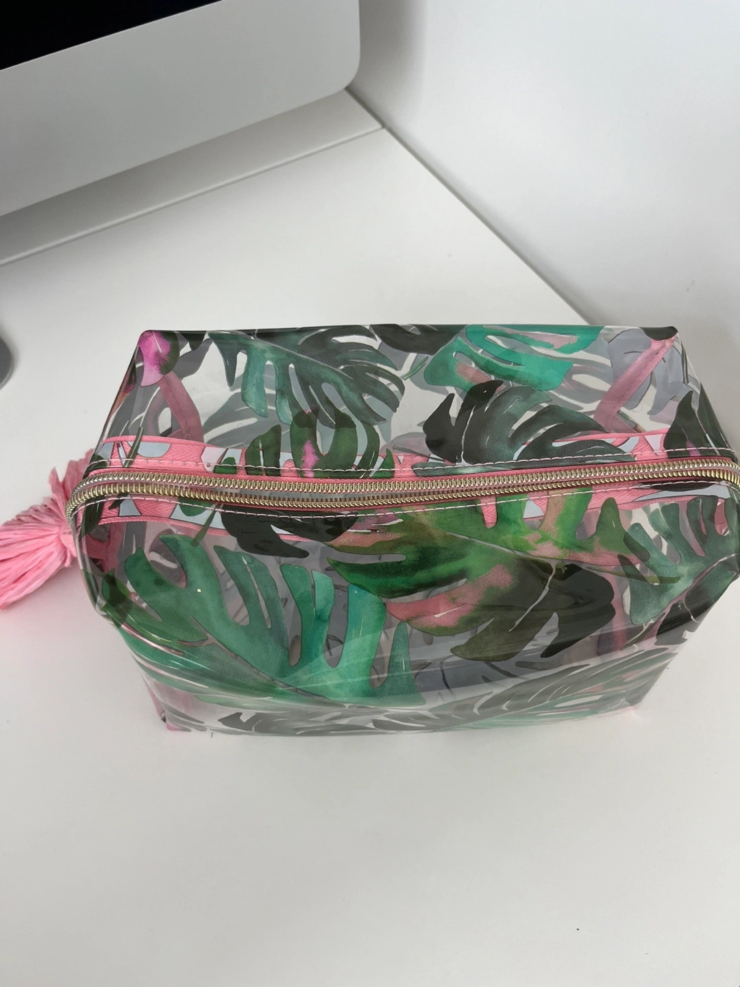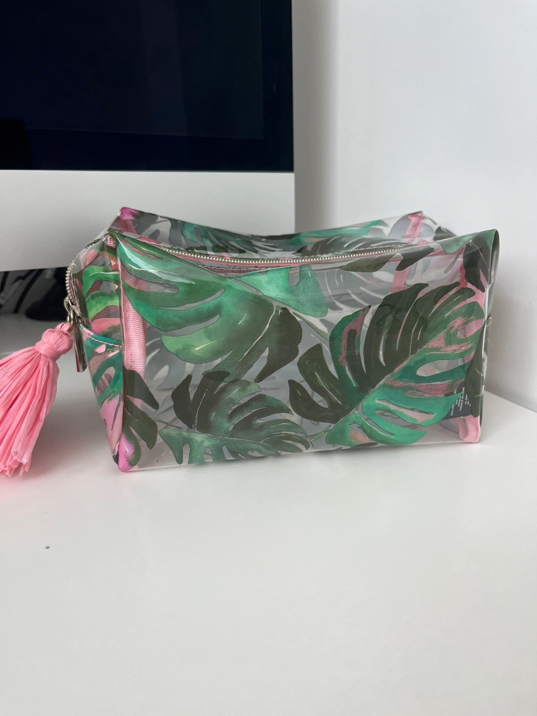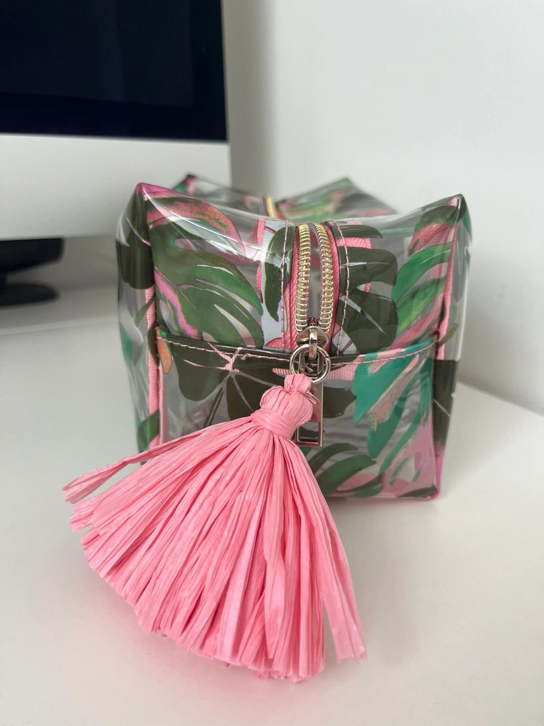 A cute clear makeup bag. Adorned with a monstera leaf pattern. Features a pink zipper with a tassel. Perfect for keeping your cosmetics organized while travelling.