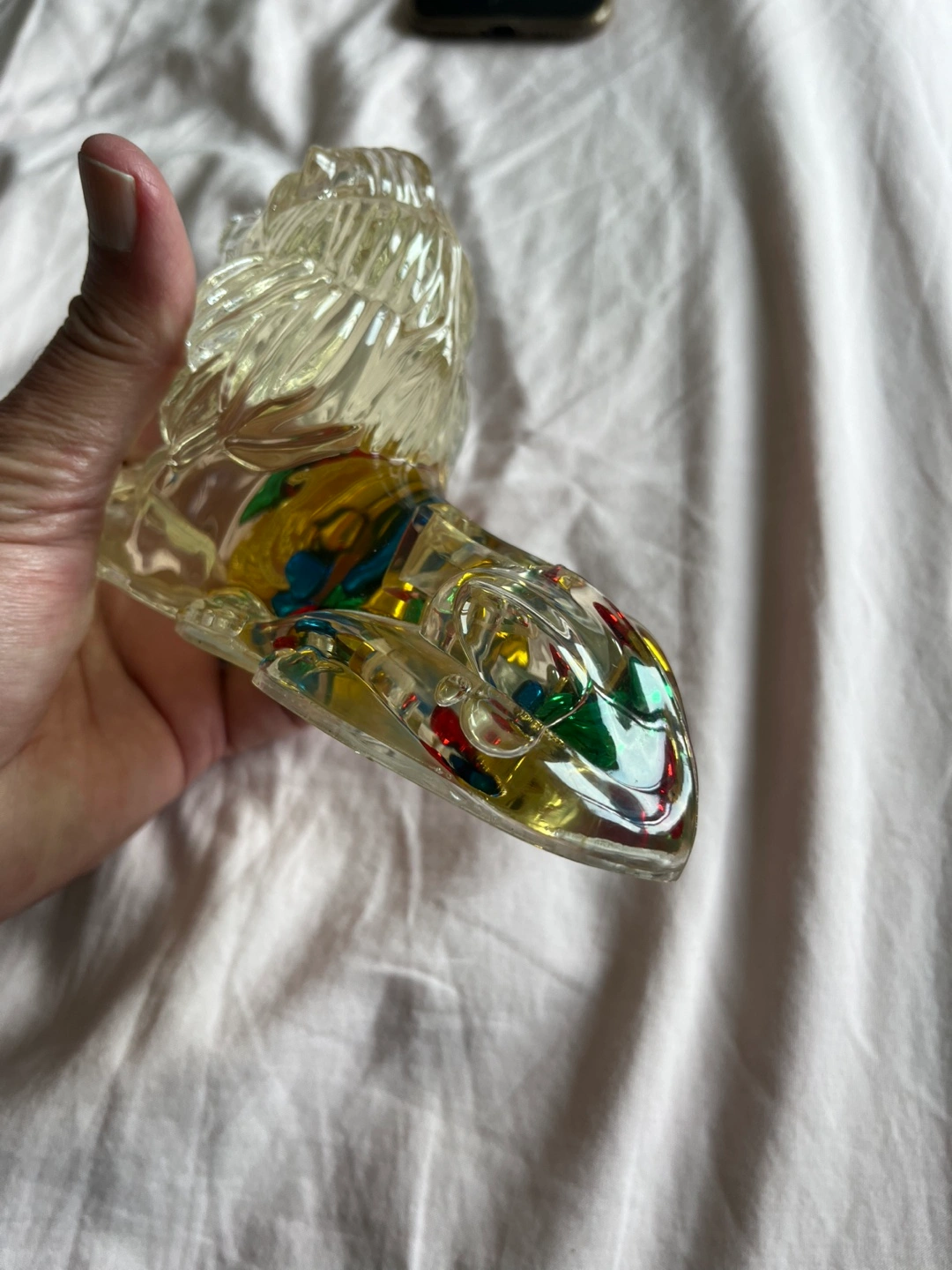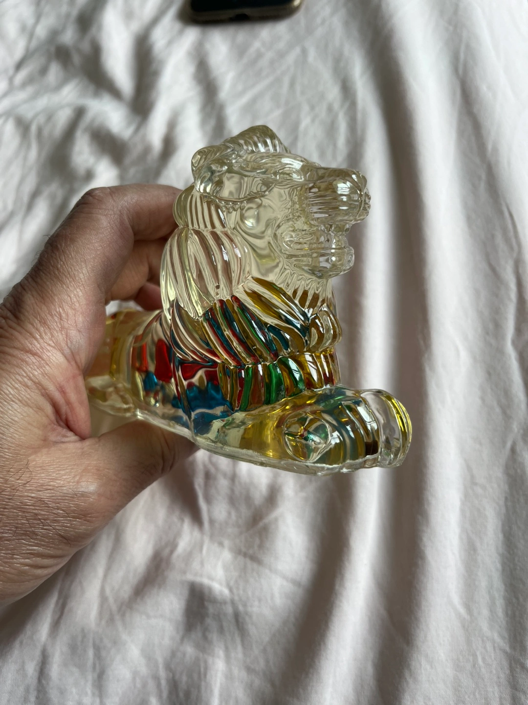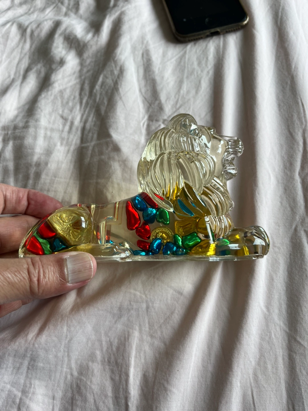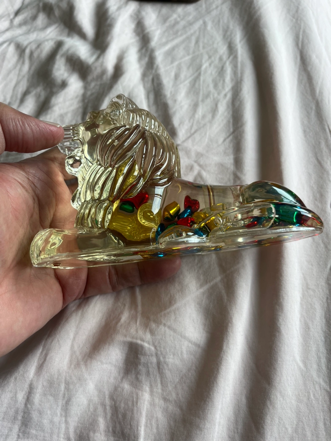 286Ornament in the shape of a lion. Clear, glass-like material. The lion is filled with colorful accents inside. A nice piece for quiet moments.