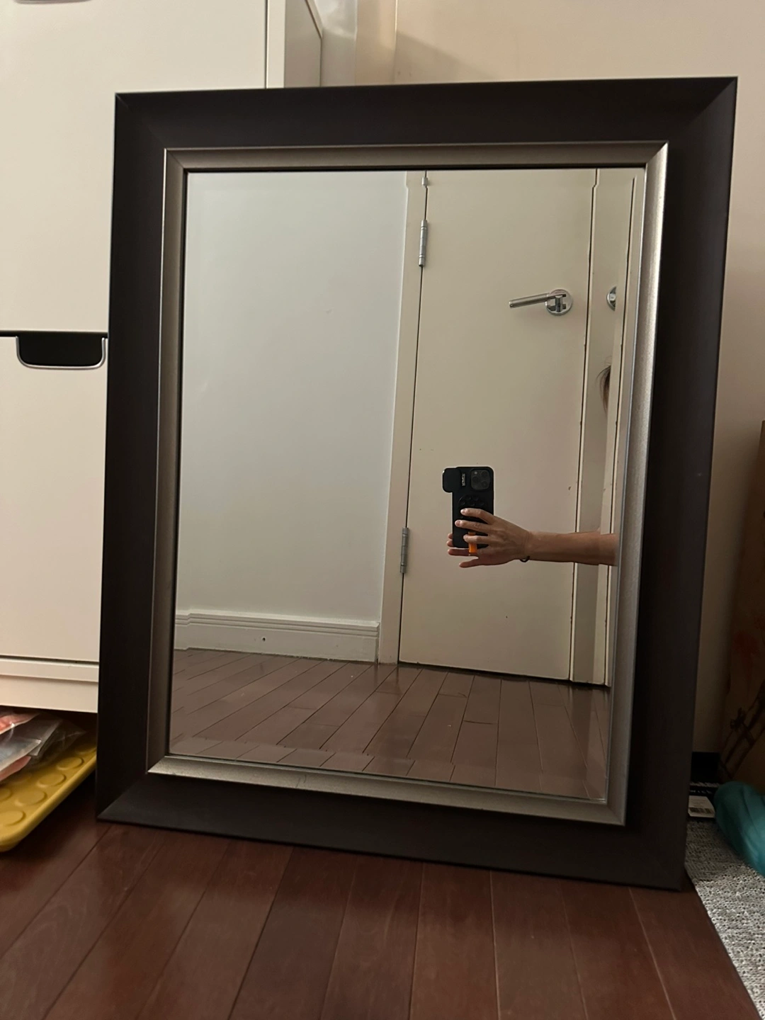 The mirror has a dark brown frame with a silver interior border. It is a nice size, perfect for a bedroom or entry way.