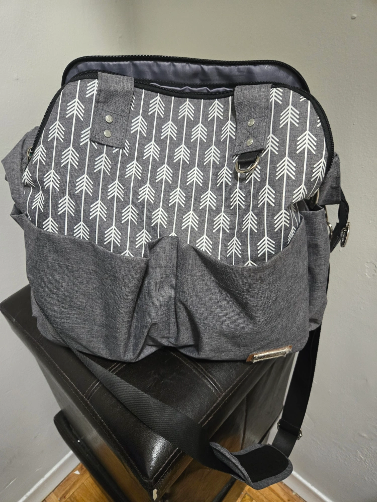 230Diaper bag with a grey and white arrow print. Features multiple pockets on the outside. Includes a shoulder strap. An organized diaper bag can help make your day feel much less hectic