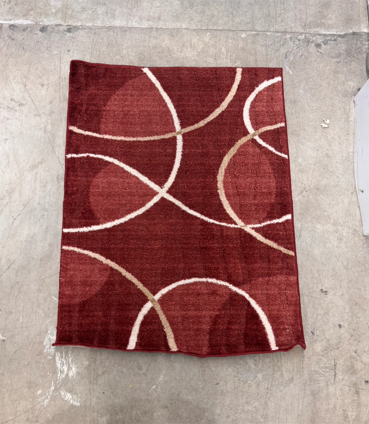 This is an area rug with a geometric pattern in red and cream. It's made of durable material. Use it to add a touch of style to any room!