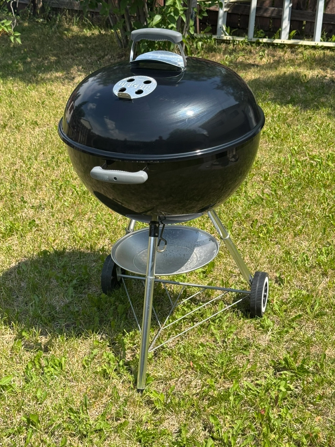 Weber kettle charcoal grill, new never used. Owner manual included. A classic charcoal grill. Features a lid with a handle. Sitting on a metal frame with wheels and a bottom shelf. Perfect for a calm, outdoor meal. Ash catch plate has some weathering due to being stored outside.