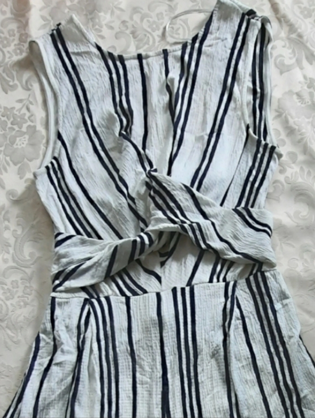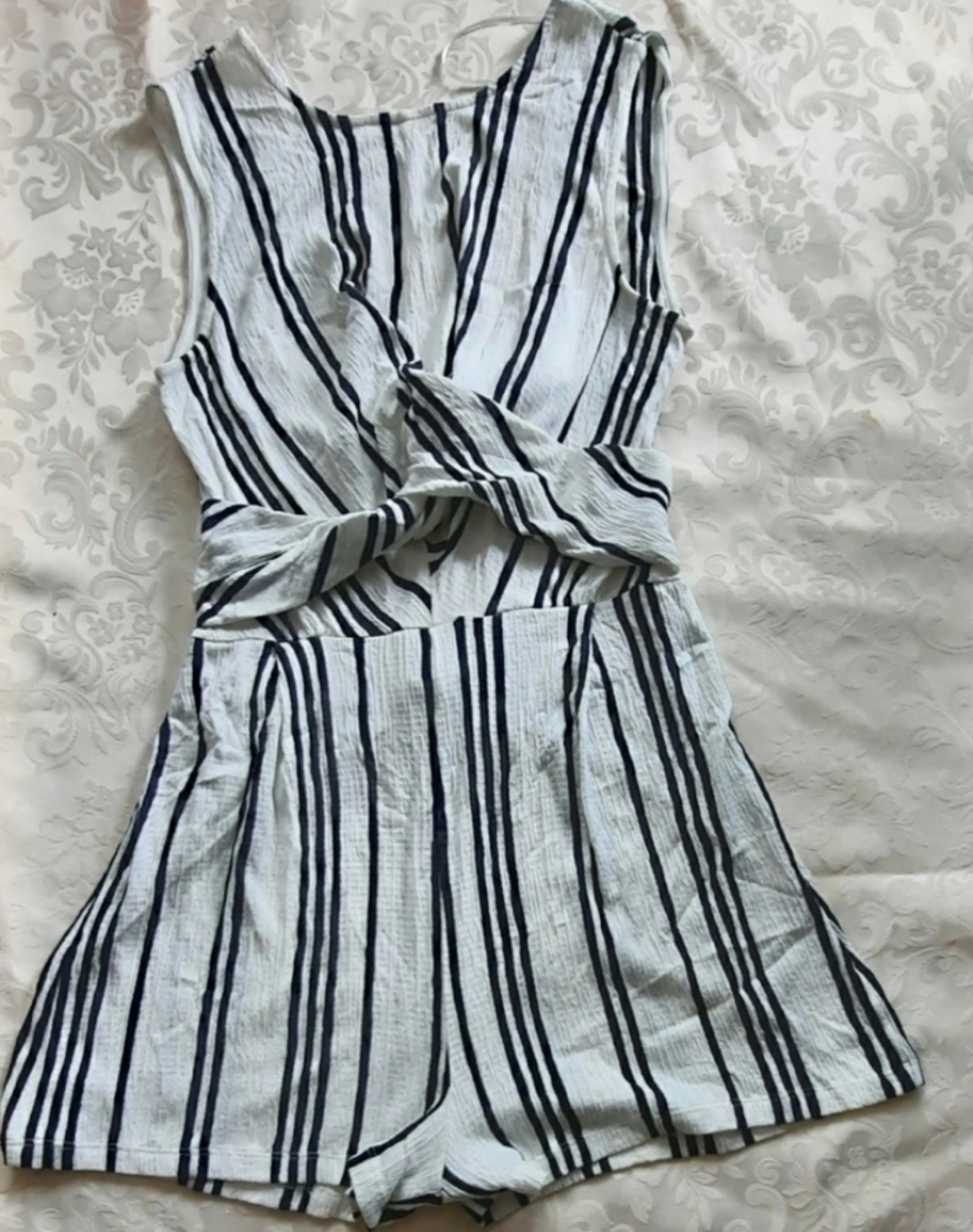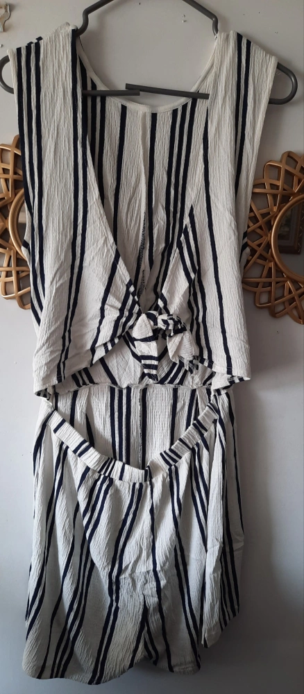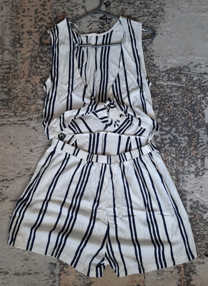 A sleeveless romper. White with black vertical stripes.