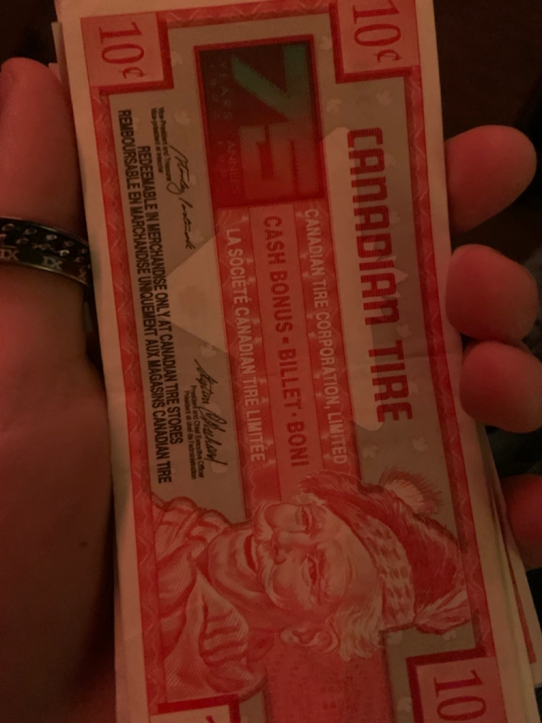 A collection of Canadian Tire cash bonus coupons. Each coupon has the denomination 10c. The design features a festive theme with red and white detailing. 1974 CANADIAN TIRE MONEY .50 FIFTY CENT NOTE NO PRINT DATE