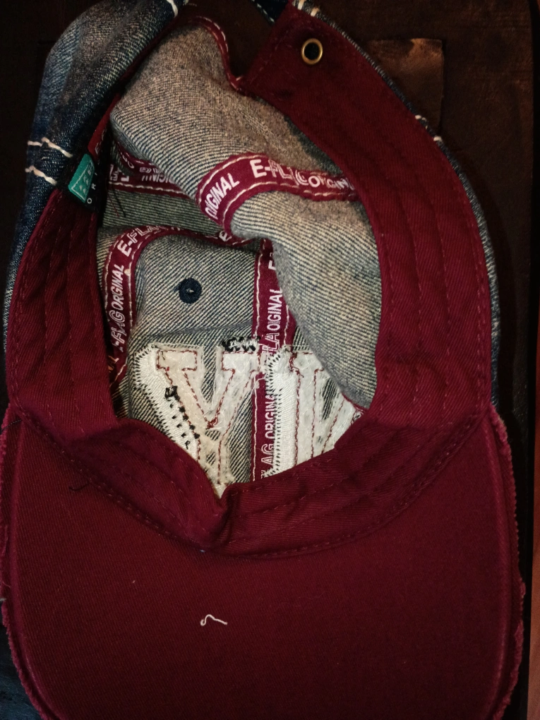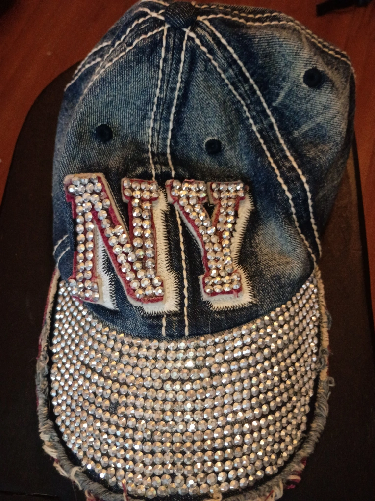 302A denim baseball cap. The cap features rhinestones on the brim and the letters NY. Its interior has a red lining. You can wear this cap for sunny days to protect your eyes from the glare of the sun. #thriftypick