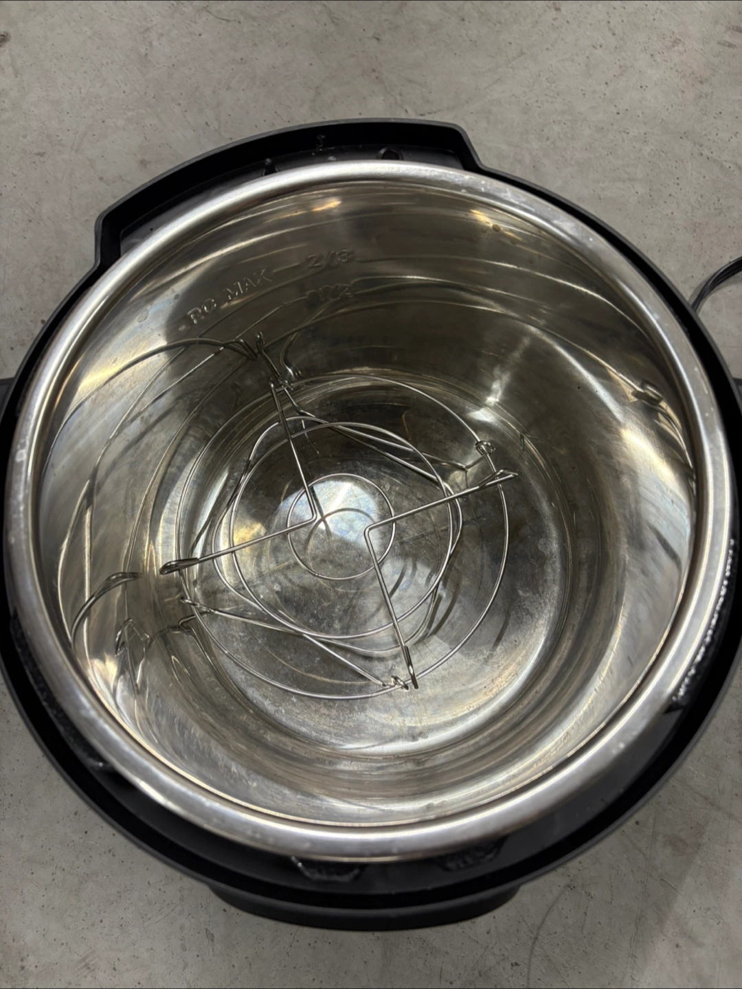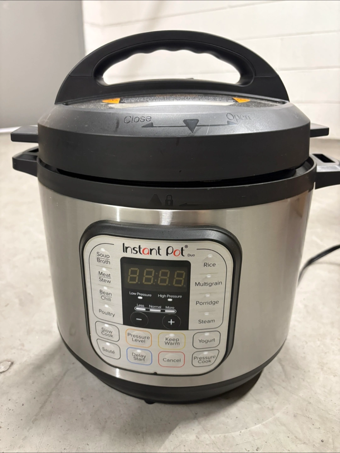 46Pressure cooker. Stainless steel inner pot. Features a black exterior. Perfect for creating quick and easy meals, especially when you're short on time and need something comforting. Have used this only once. Bought it for 250$ from Amazon.