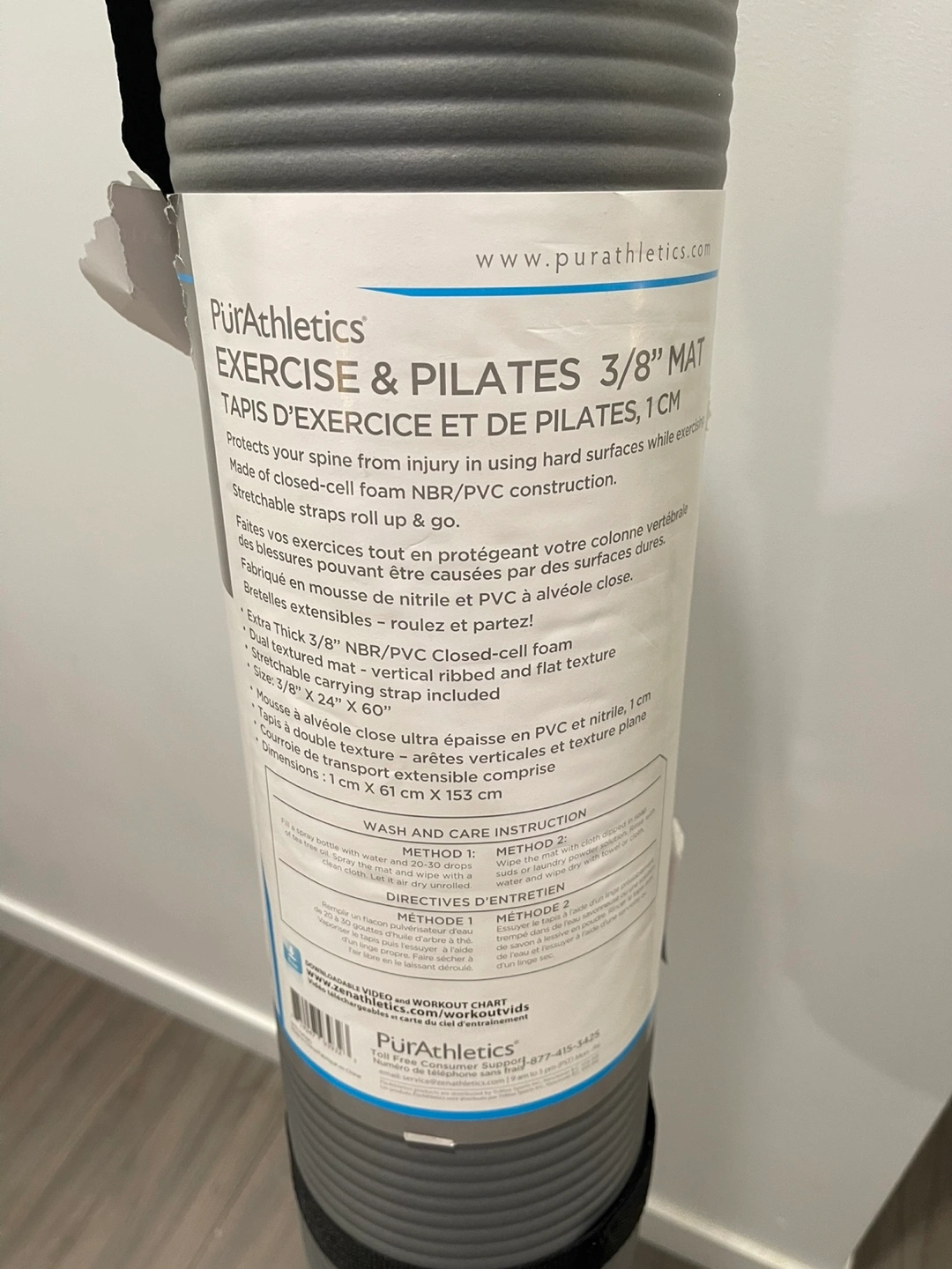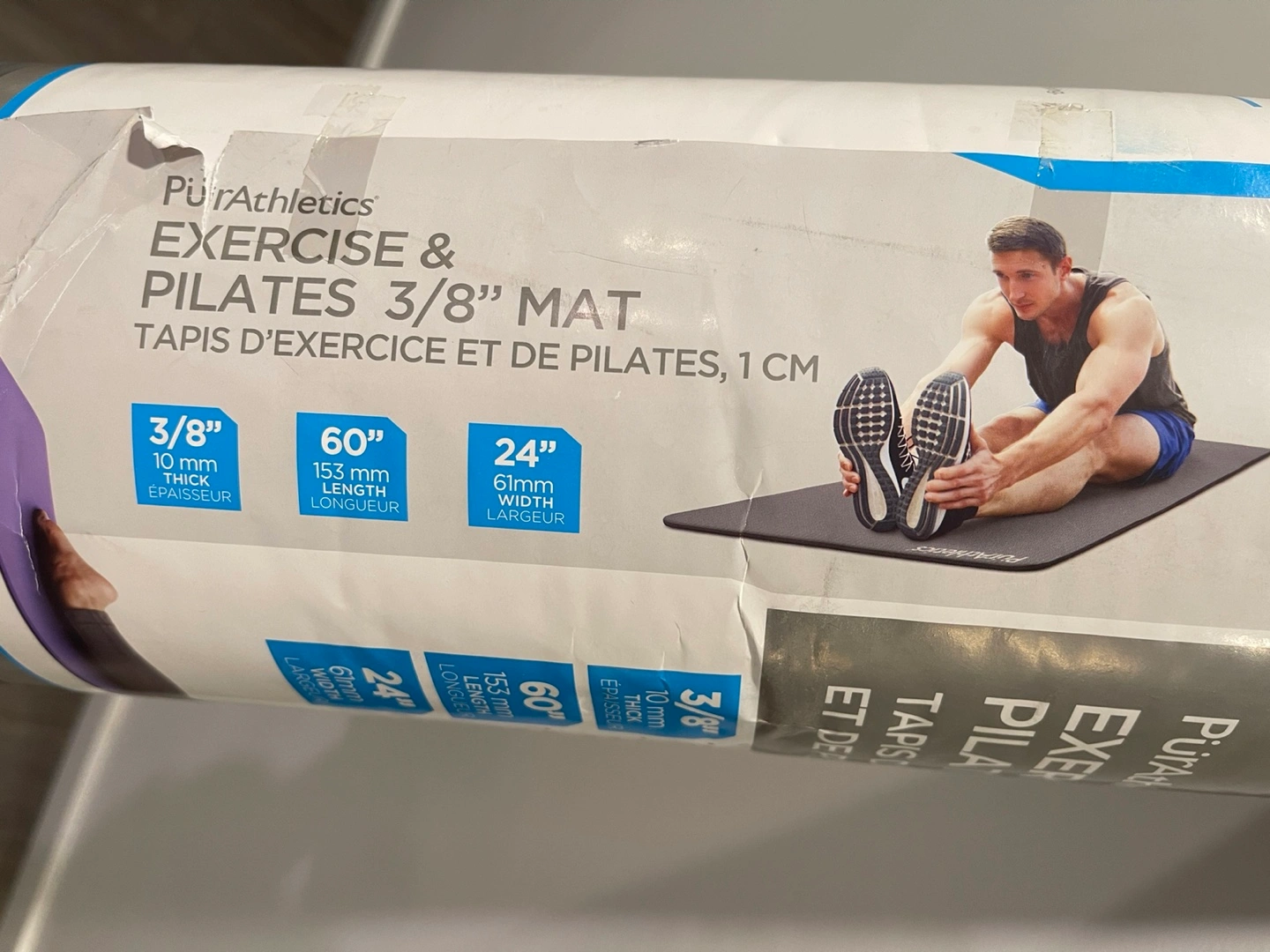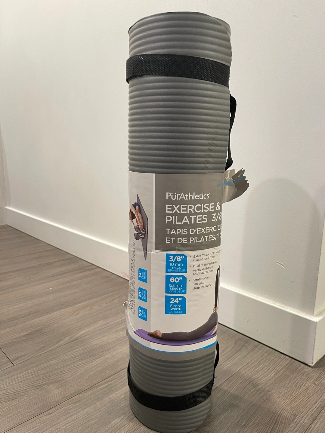 A PürAthletics exercise and pilates mat. Features dimensions of 60" length, 24" width, and 3/8" thickness. Includes carrying straps. Roll it out and find your zen moment.