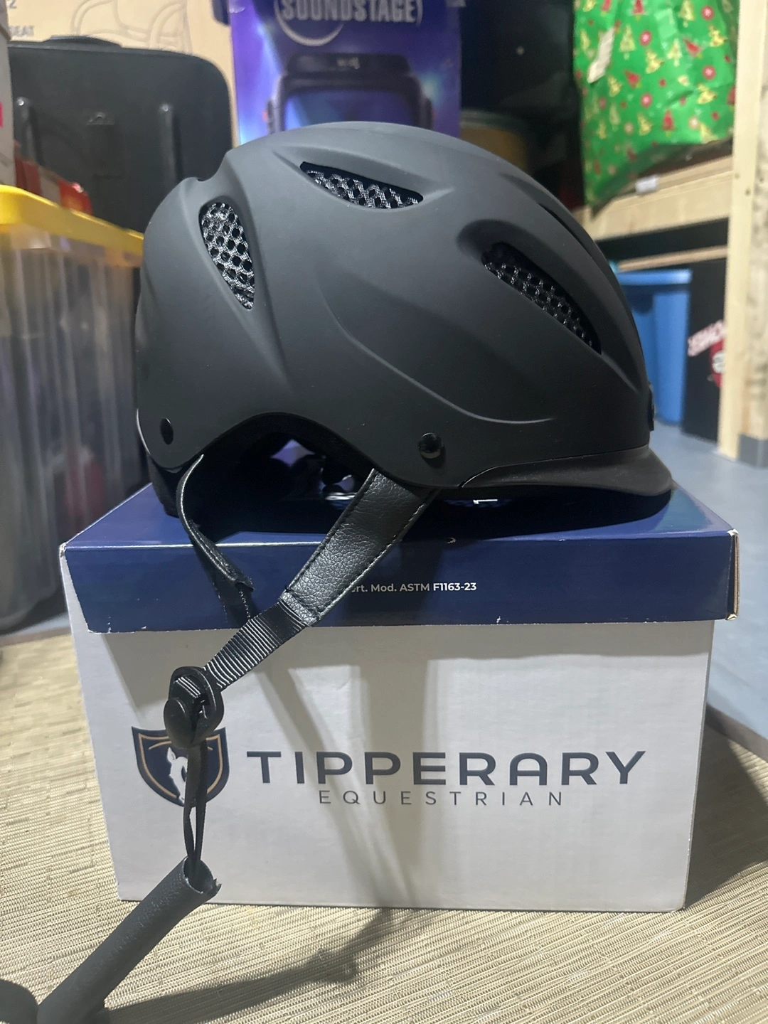 Black equestrian helmet. Still in the box. Includes paperwork and accessories. It can keep your head protected while pursuing your passion. Never used