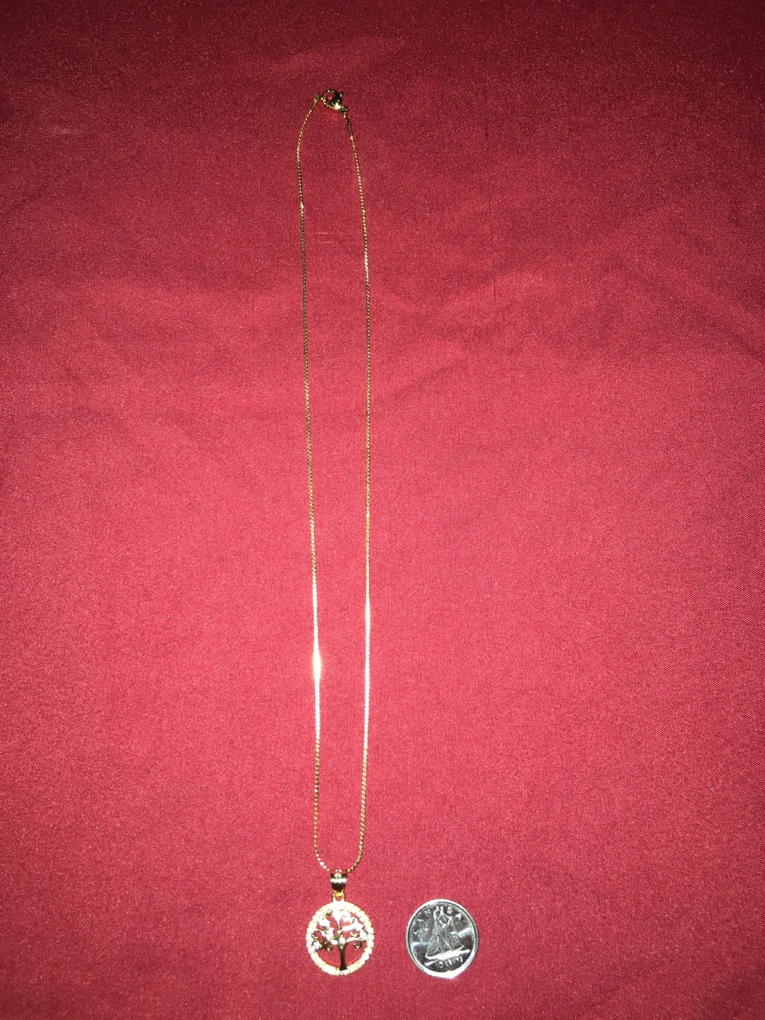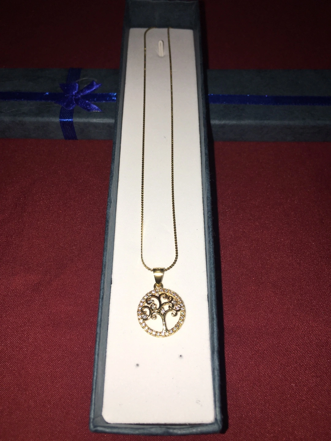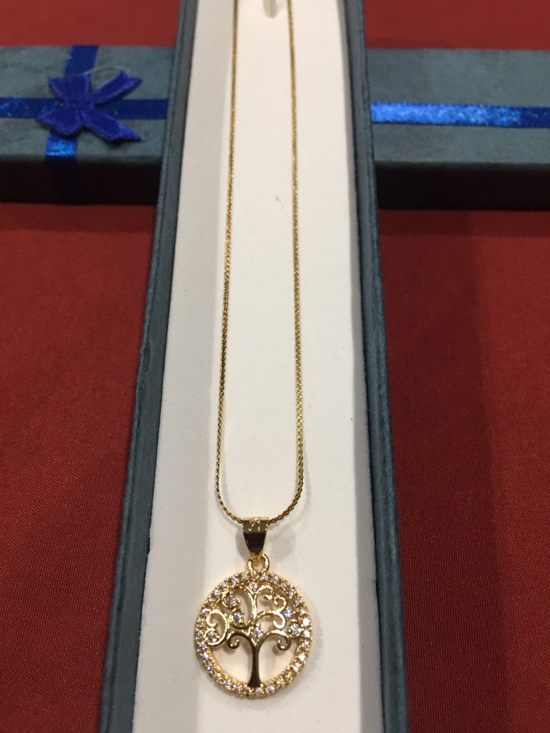 A gold-toned necklace. Features a chain and pendant. Pendant with a tree design, surrounded by small, clear stones. You might love this necklace for its simple design which allows it to pair well with any outfit.