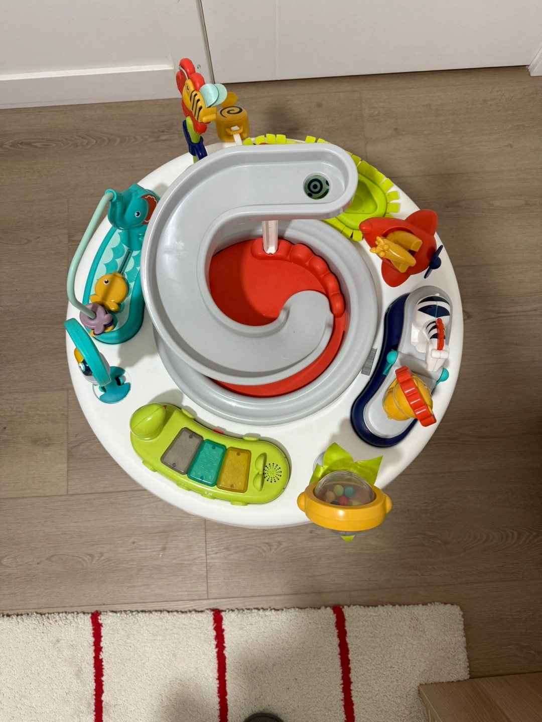 A lovely activity table with a variety of features. Contains multiple fun toys. The central part contains a spiral track. Such an item can provide a calm and stimulating environment for your little one.
