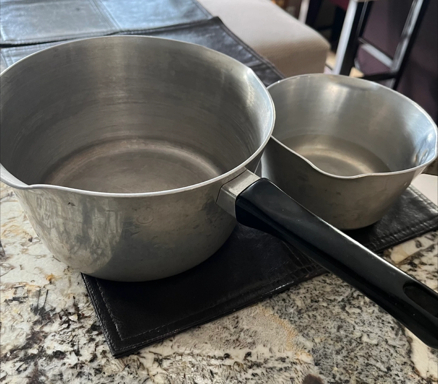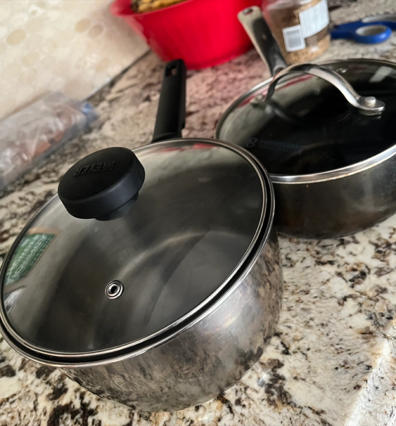 Used .. Set of pots and pans with matching lids. Handles on the pots are either black or silver. Lids are either glass or stainless steel. Cooking with these pots and pans will give you the opportunity to make a comforting meal. 10$/each