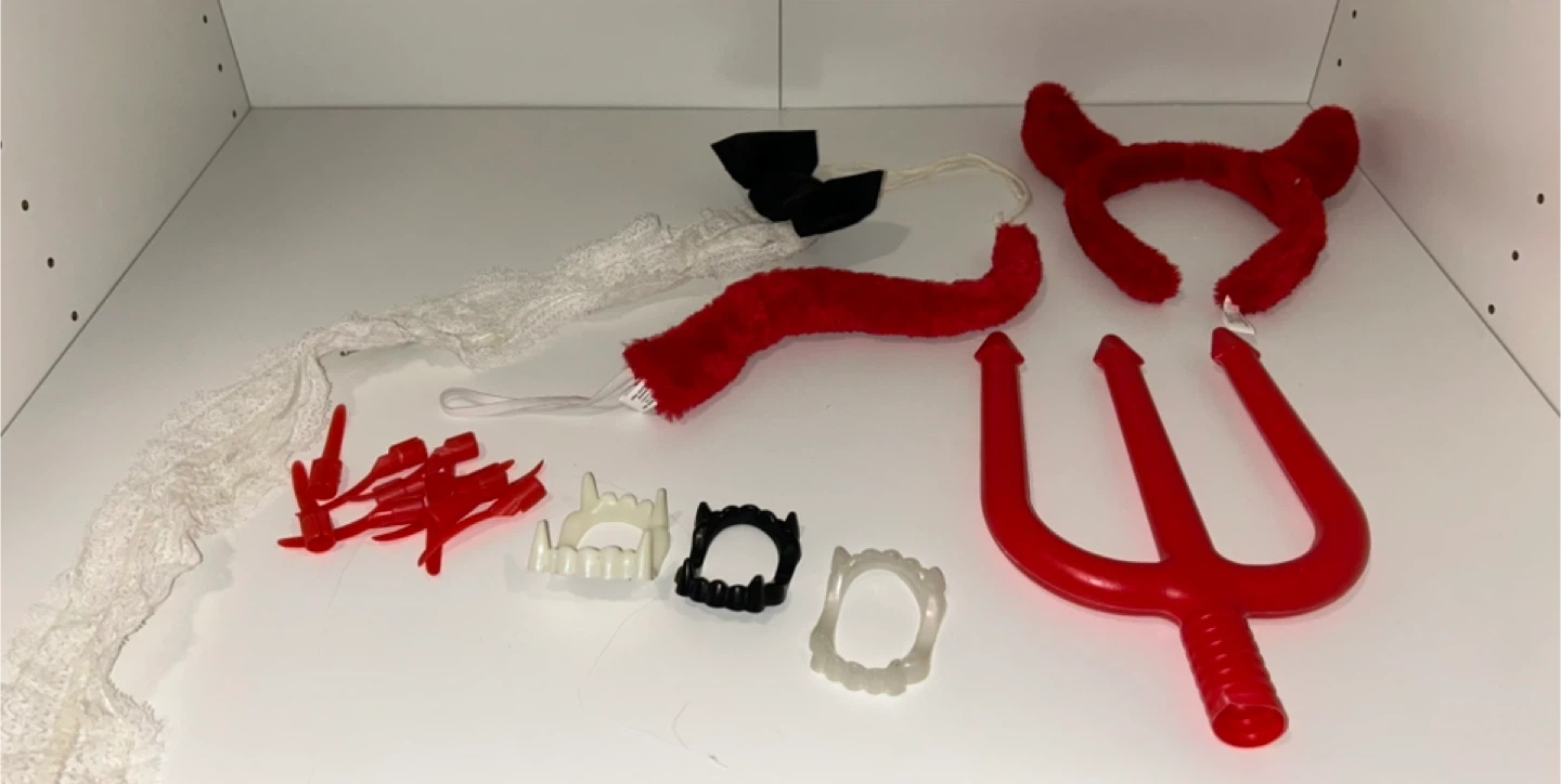 Who’s that handsome devil? This devil costume accessory set includes a headband with horns, a red fuzzy tail, a trident, fangs (in three different colours), red fingernail extensions, and a lace trim with bow tie. It's perfect for Halloween or costume parties! Can be paired with the red and black magician’s cape for extra flair.