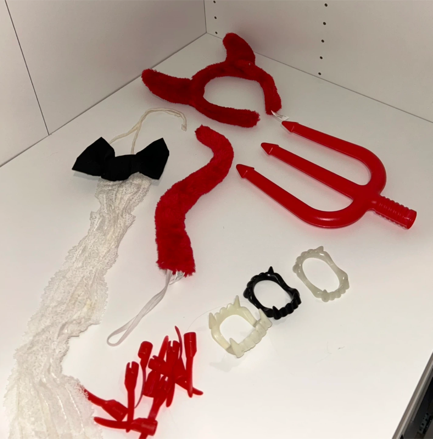 Who’s that handsome devil? This devil costume accessory set includes a headband with horns, a red fuzzy tail, a trident, fangs (in three different colours), red fingernail extensions, and a lace trim with bow tie. It's perfect for Halloween or costume parties! Can be paired with the red and black magician’s cape for extra flair.