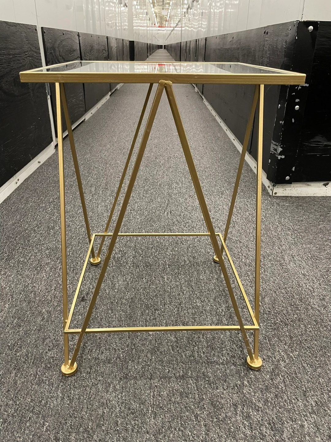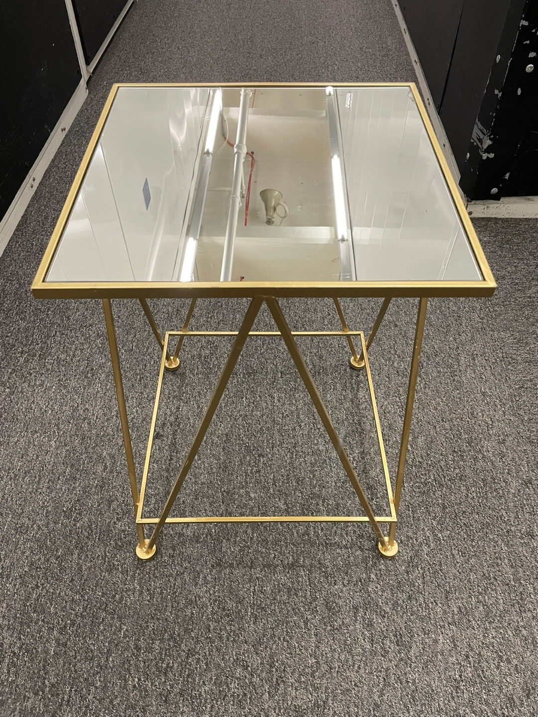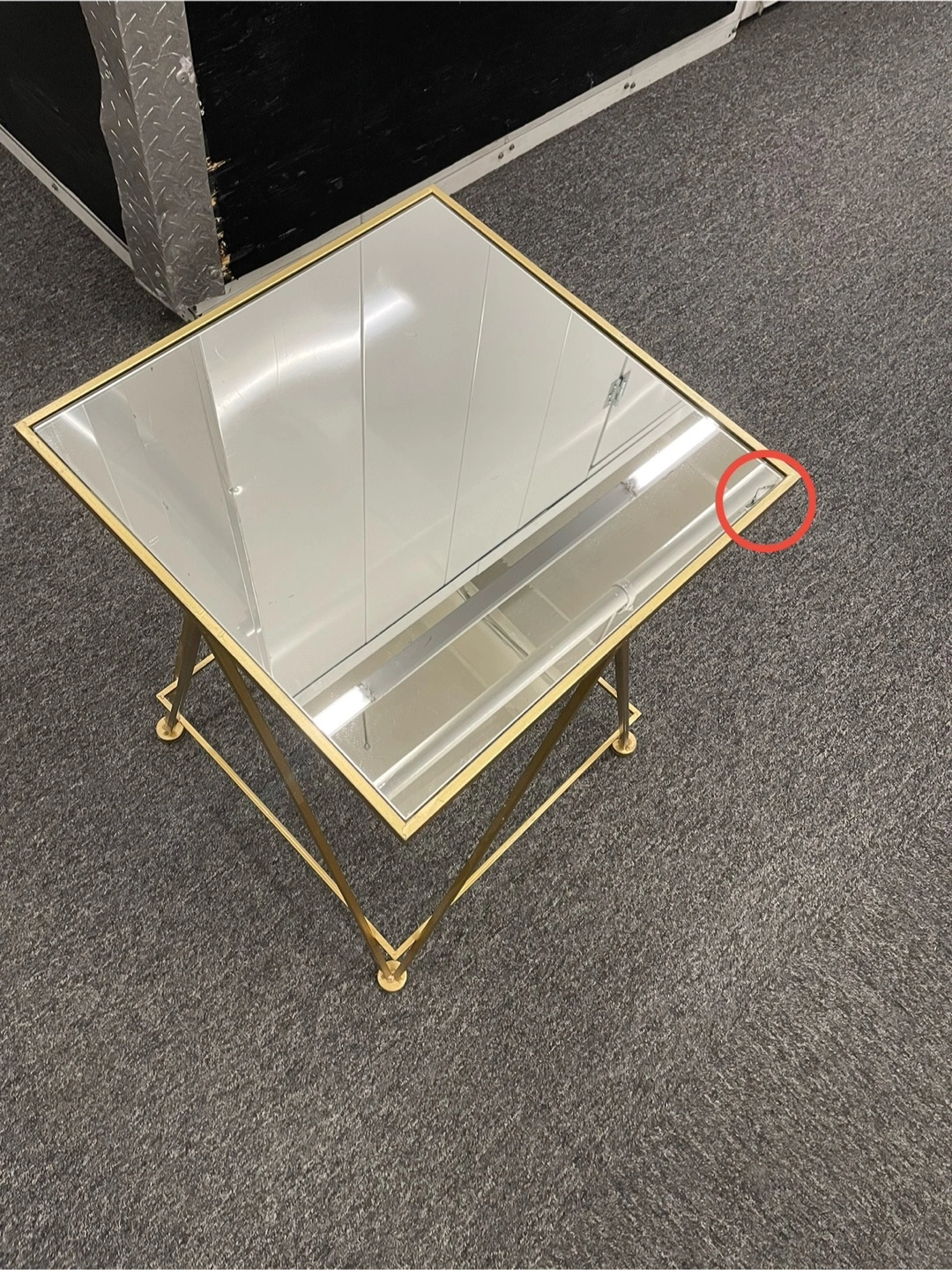 295This square side table is perfect for a minimalist or modern space. It features a glass top and a gold-tone metal frame. With its geometric shape and clean lines, it could be a great addition to your living room. *Minor Damage on the glass top (circled in red on photo # 3)