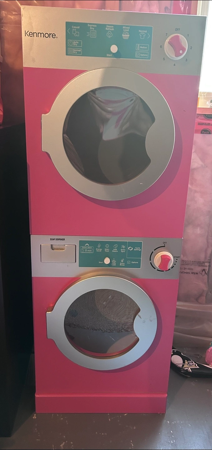Pink toy washing machine and dryer set. Features knobs, buttons, and doors. A great item to help your little one explore the world around them at their own pace.