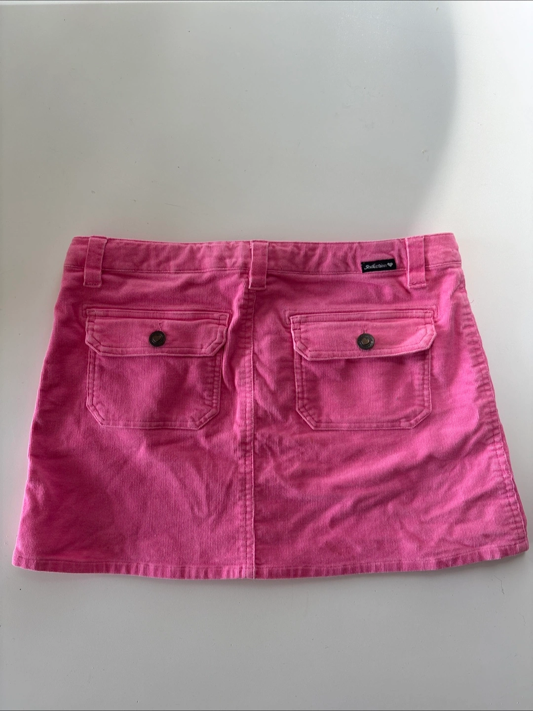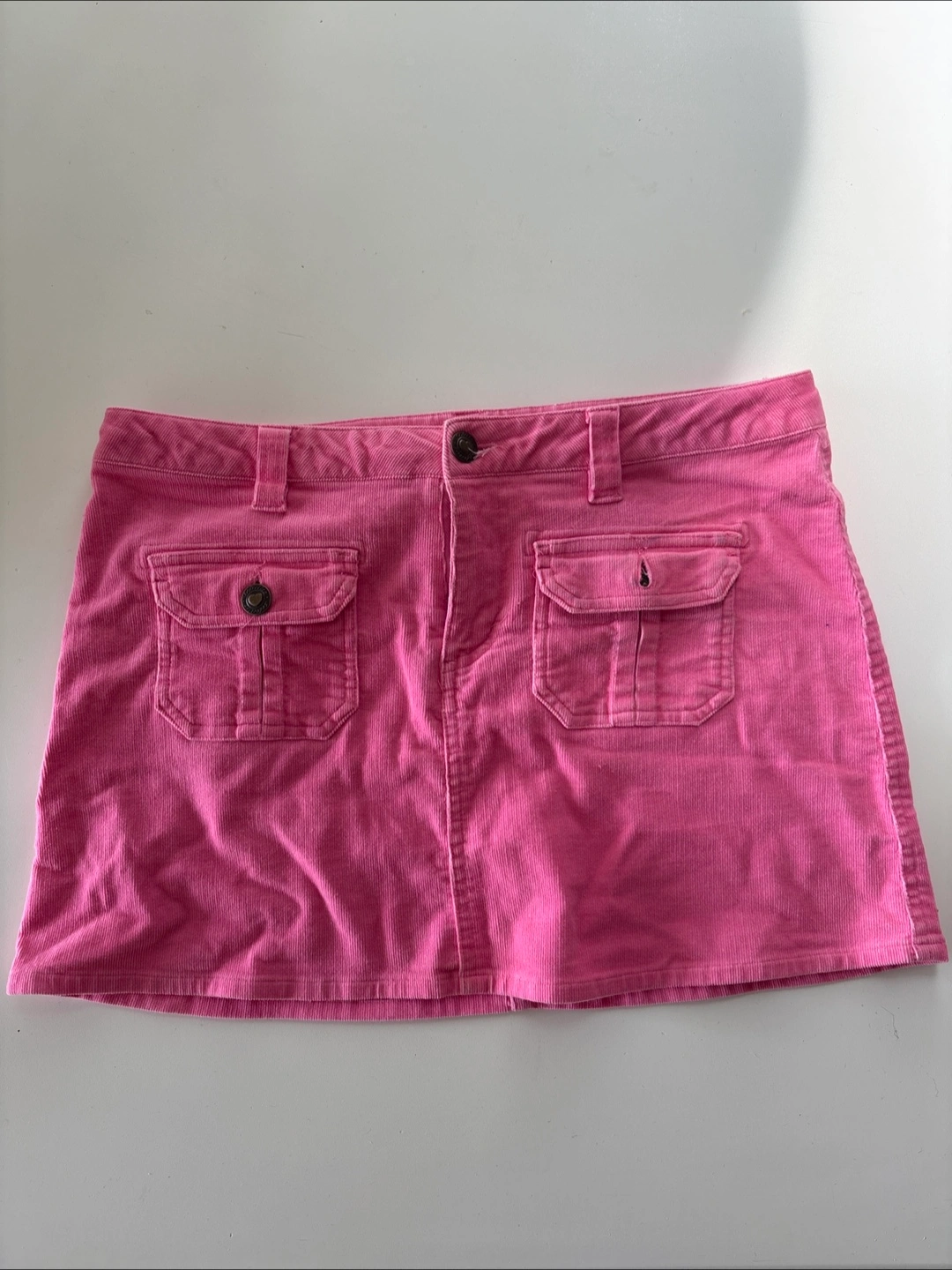 A pink mini skirt. It has two front pockets as well as two back pockets with buttons. Perfect for summer time!