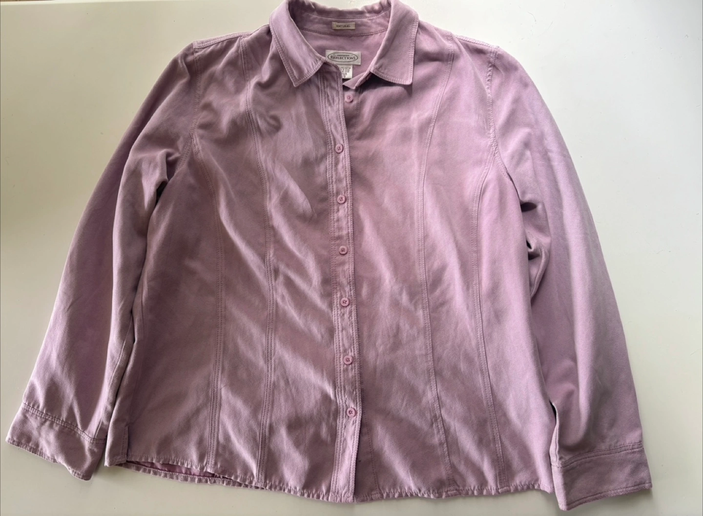 Polyester Button-up collared shirt. Long sleeves. Front button closure. Vertical seam detailing.