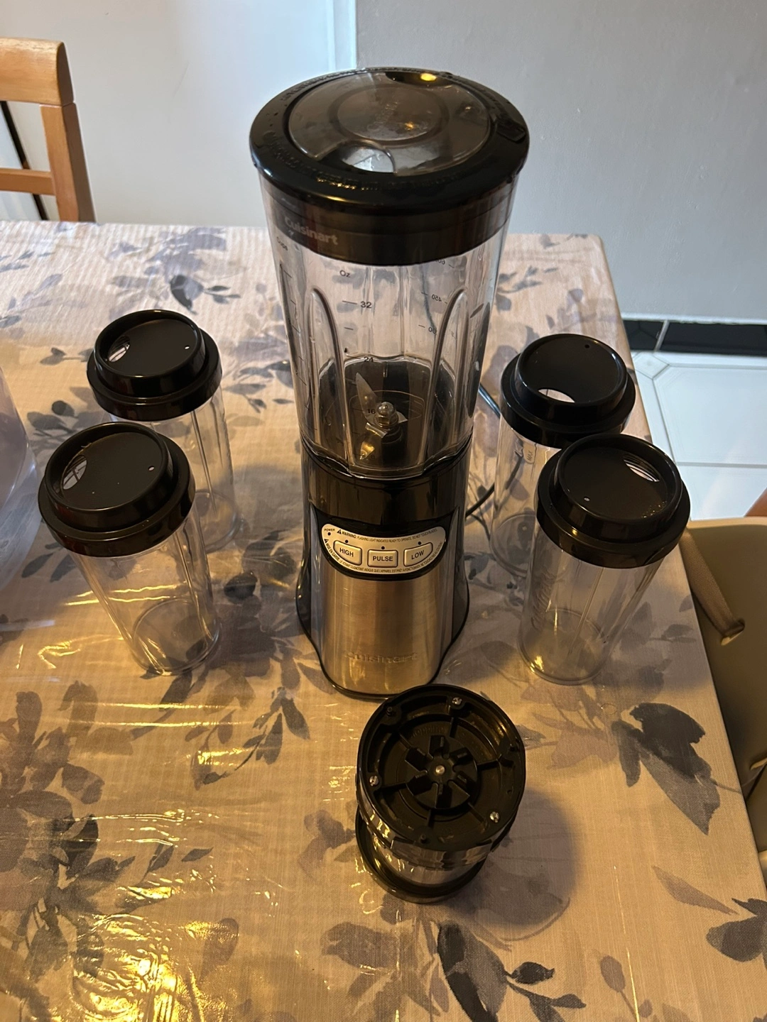 Moving! Used blender with several to-go cups. The blender's base is mostly silver with black accents and buttons. You can make yourself a nice smoothie in the morning with it, to make your day start right.