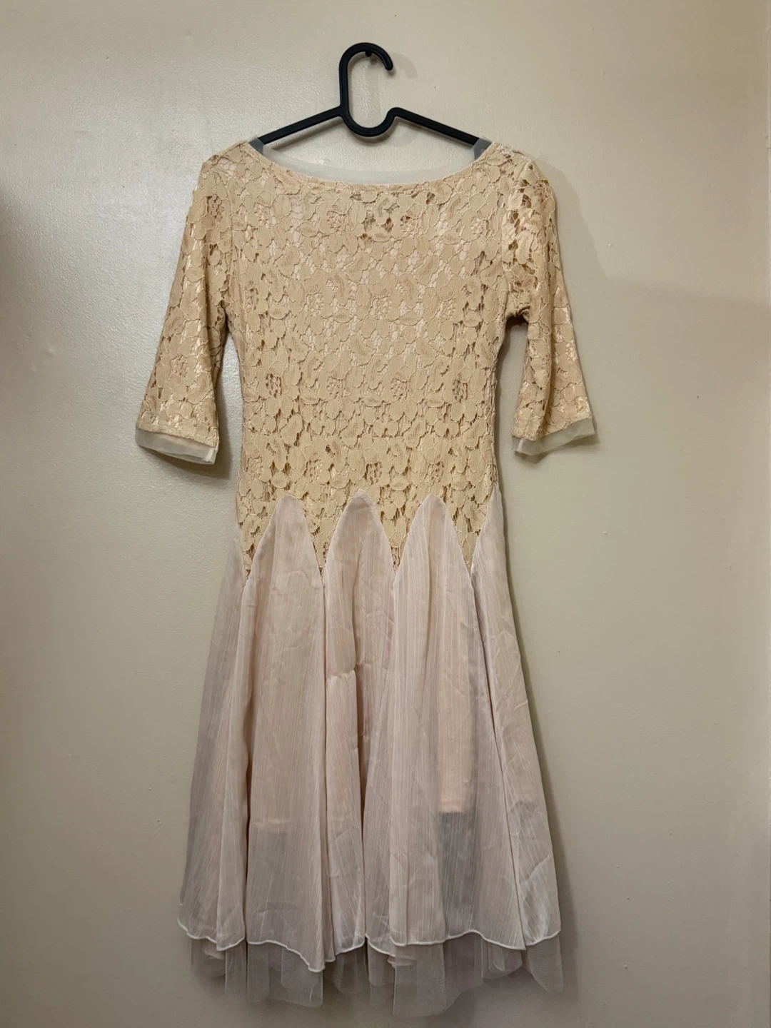 This is a beige lace dress, perfect for a special occasion, in girls size M/L, and in great condition. The dress features delicate lace detailing on the bodice and a flowing skirt. It's been gently and lovingly worn, ready for a new twirl on the dance floor or a debut at a tea party!