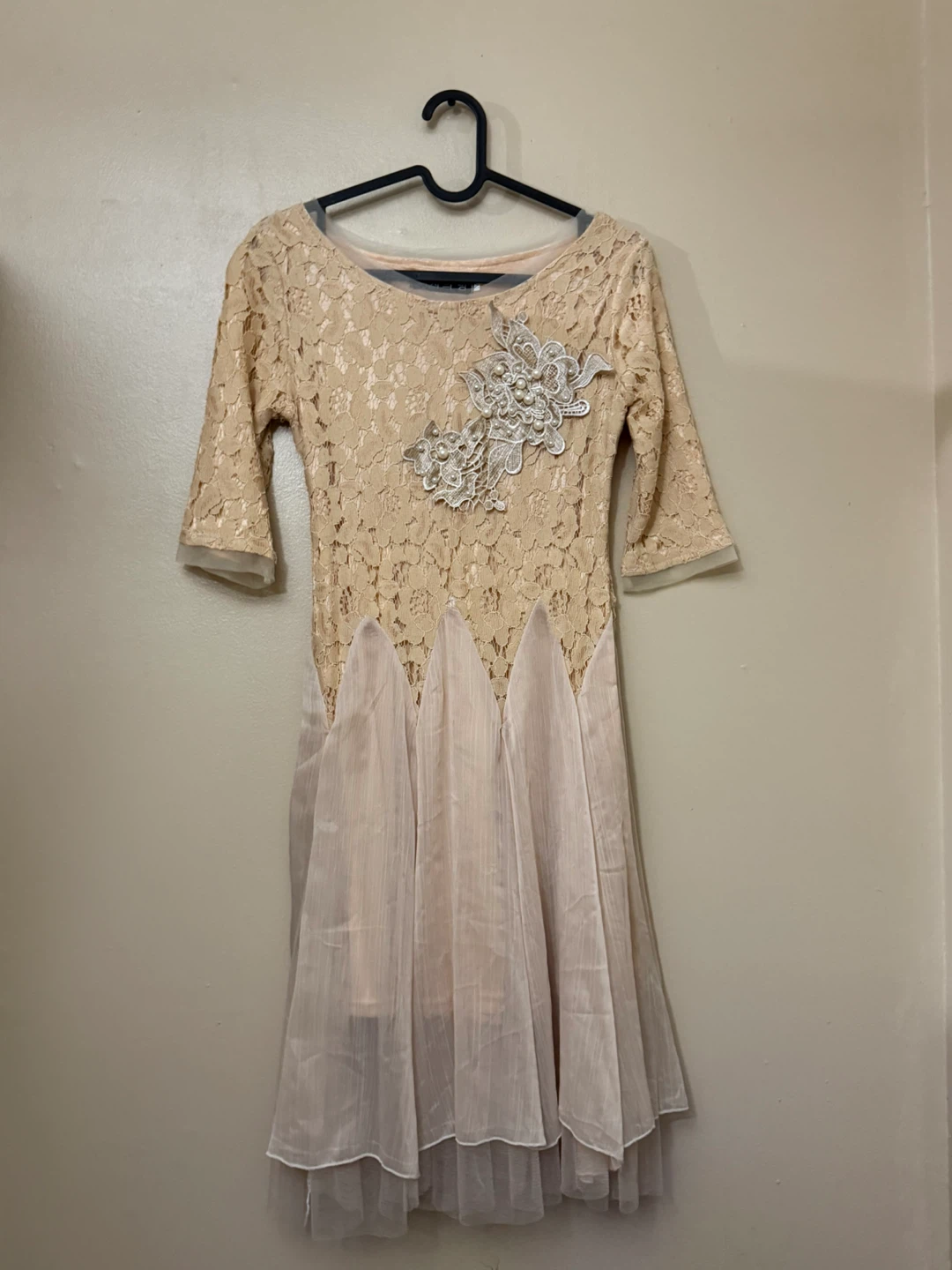 This is a beige lace dress, perfect for a special occasion, in girls size M/L, and in great condition. The dress features delicate lace detailing on the bodice and a flowing skirt. It's been gently and lovingly worn, ready for a new twirl on the dance floor or a debut at a tea party!