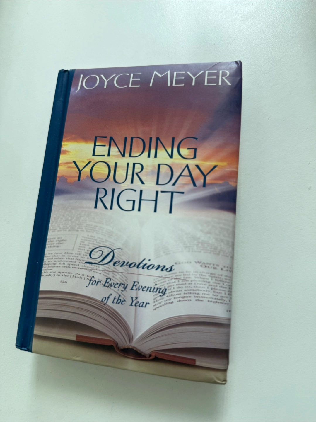 Book titled "Ending Your Day Right". Includes the author's name. Features "Devotions for Every Evening of the Year". Using this book is a peaceful way to end your day.