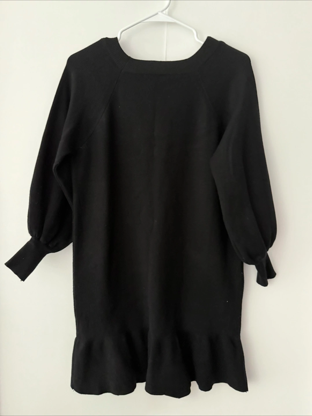 A black knit dress. Features long sleeves with cuffs. Has a crew neck. The hem is designed with a ruffle. Snuggle up in this dress on a cold day.