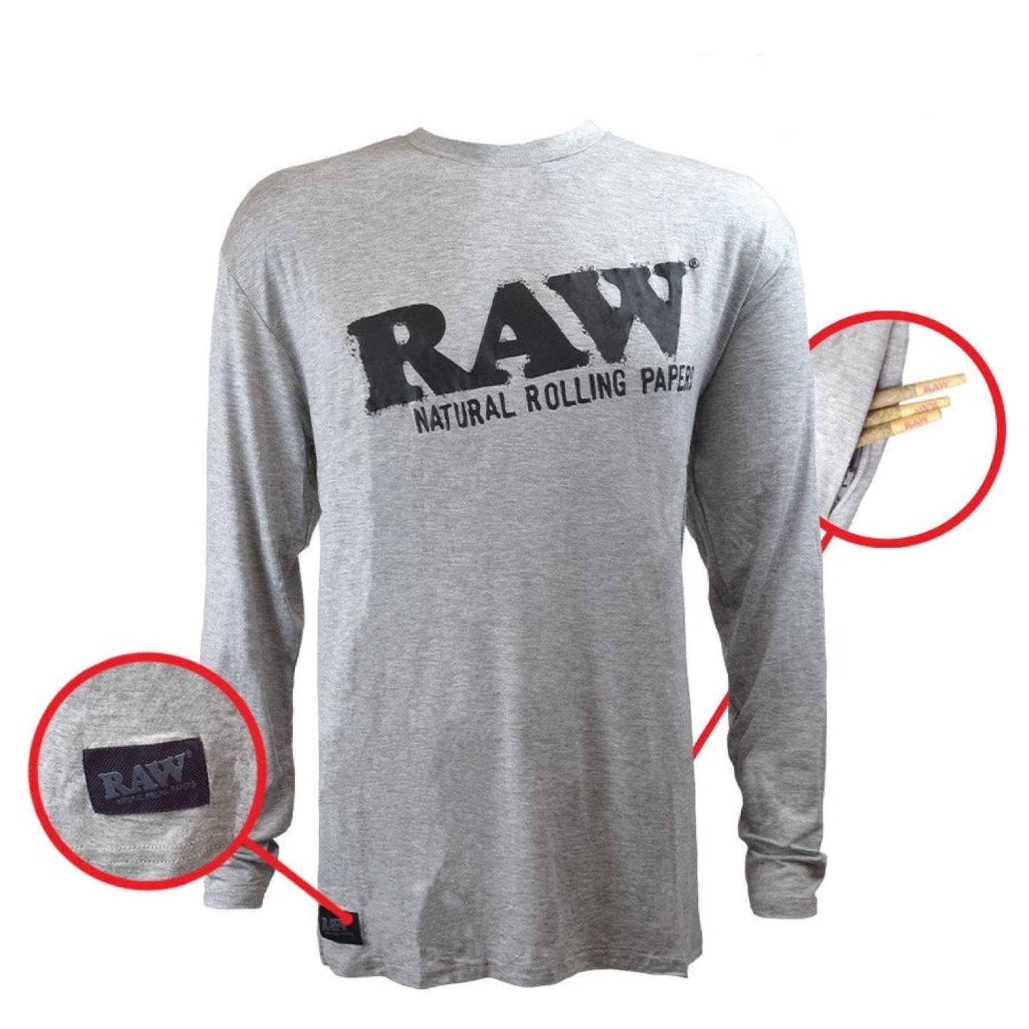 A grey long sleeve shirt, perfect for everyday wear. It has the RAW logo printed on the front and a stash pocket. This comfortable shirt might be just the thing to wear while you read.