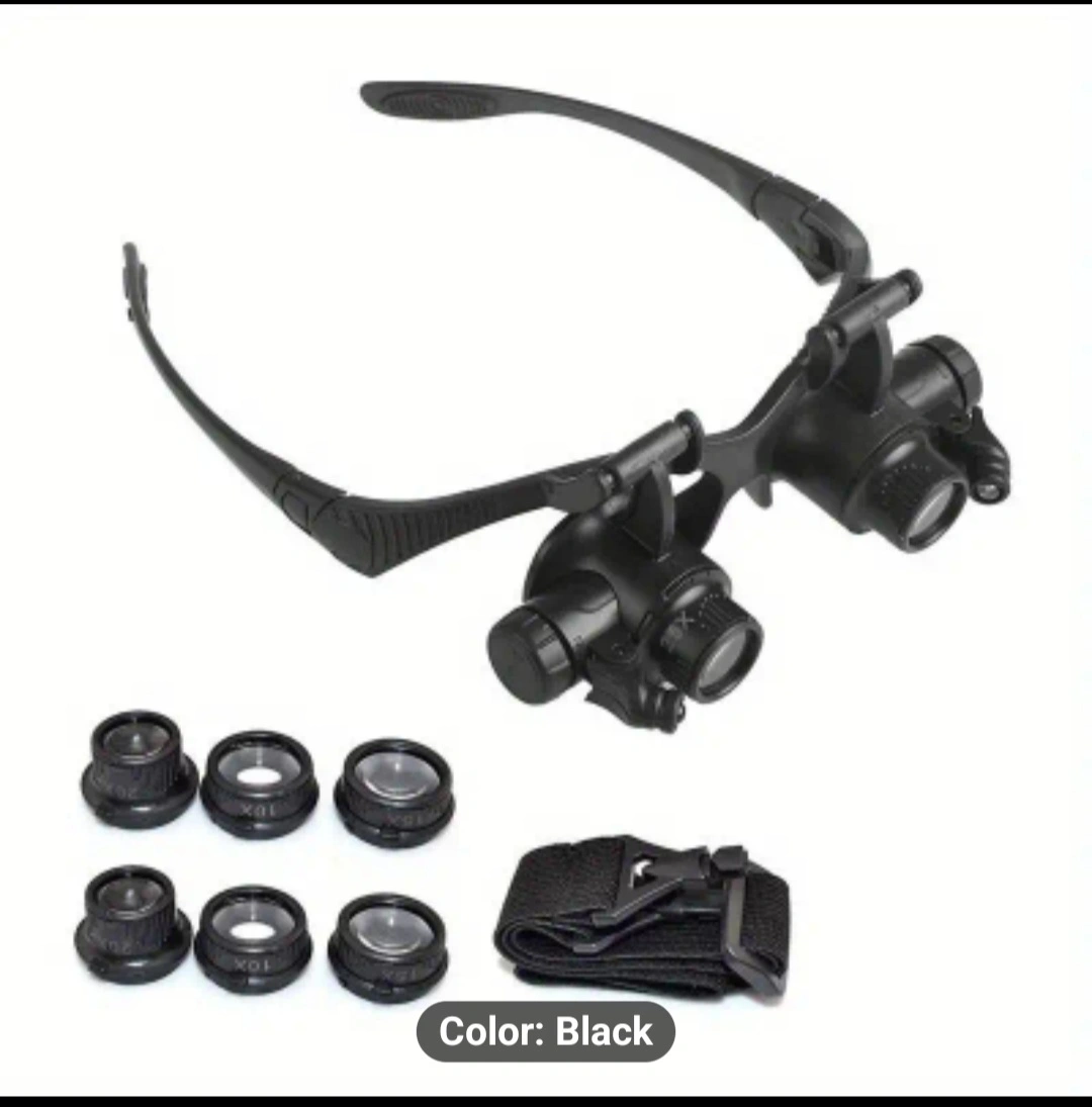A black magnifying headset. Comes with various lenses. Features an adjustable head strap. These are perfect for anyone who wants to get into detail work, and create something beautiful.