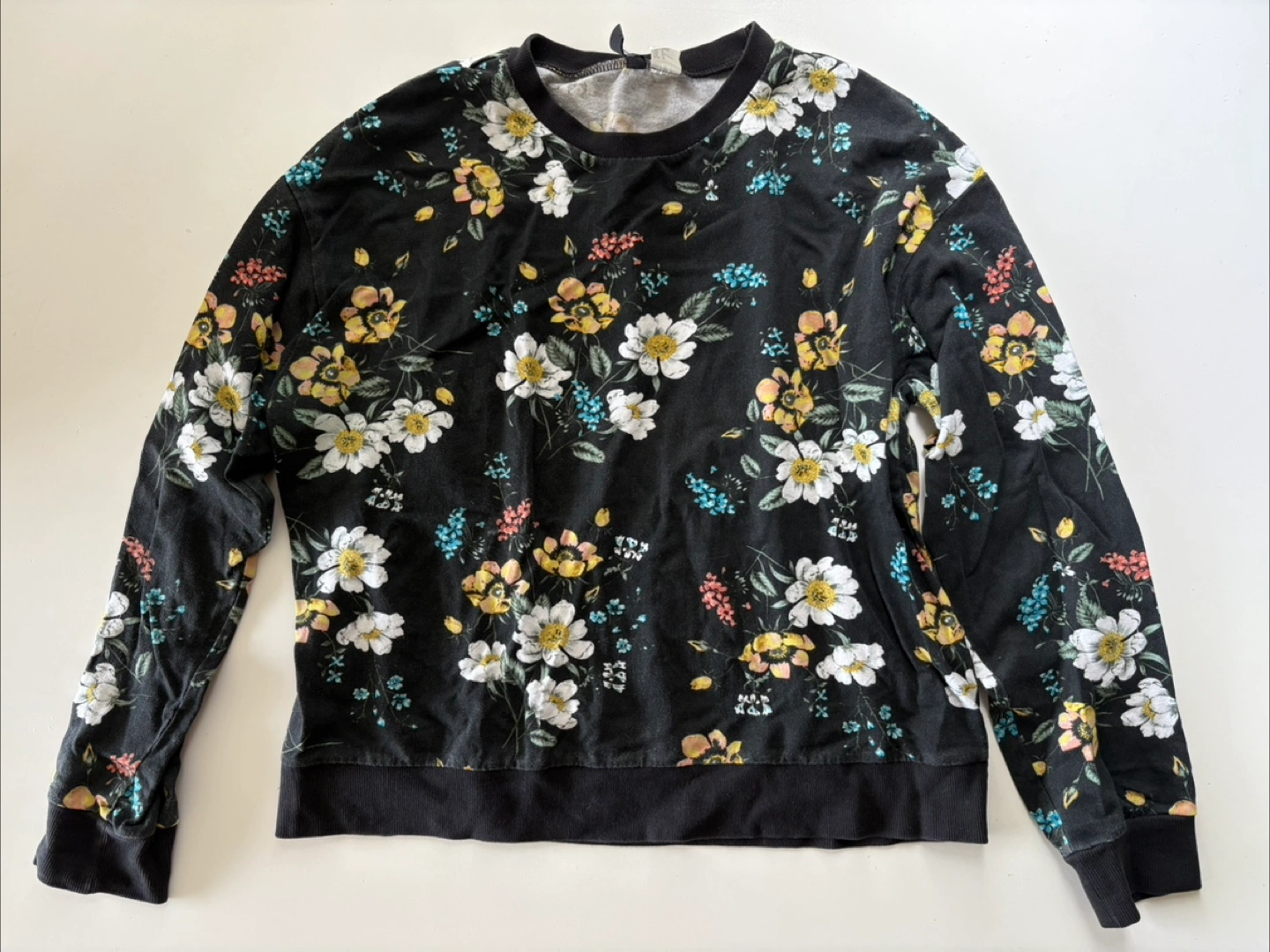 A cozy sweater in a black color featuring a floral pattern. Has a crew neckline and long sleeves.