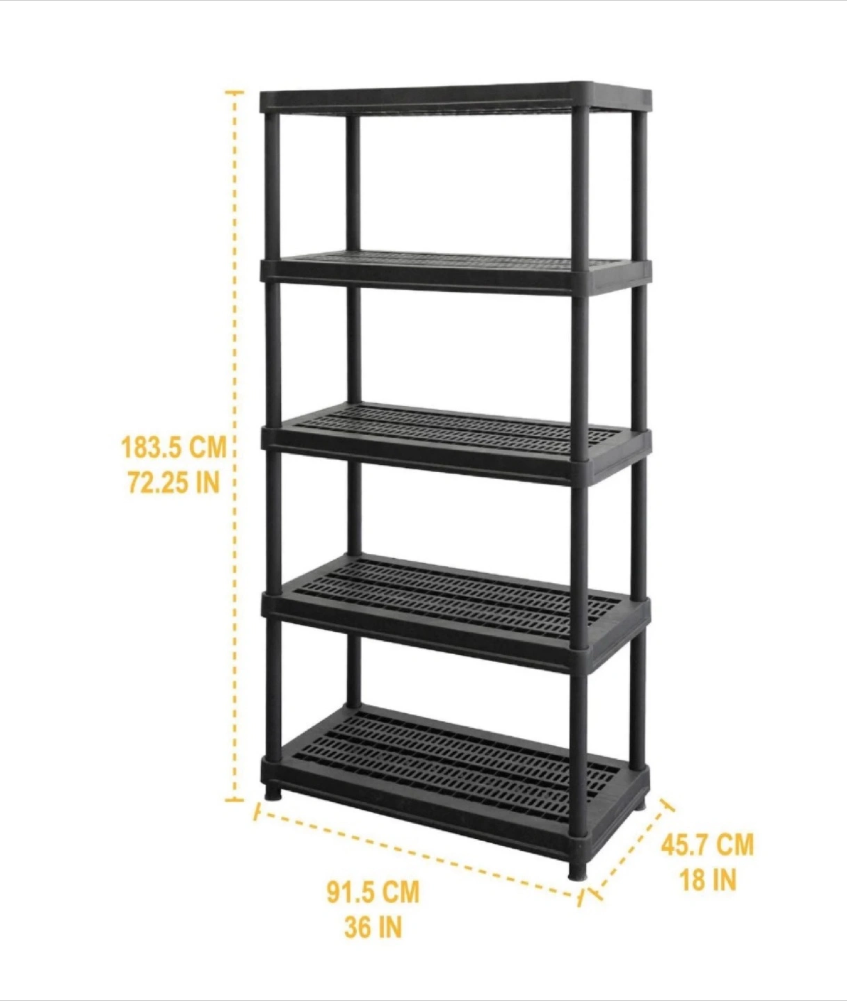 Five-tier plastic shelving unit. Black in colour. Great for organizing any room in your home, it's the perfect way to reduce clutter and create a tidy space for your belongings.