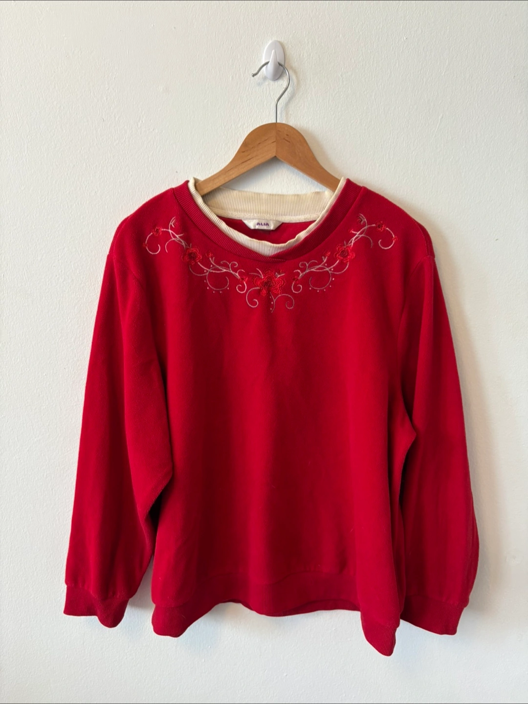 ALIA Sweatshirt in a vibrant red hue. Features an embroidered floral design around the neckline. Soft material with a white trim.