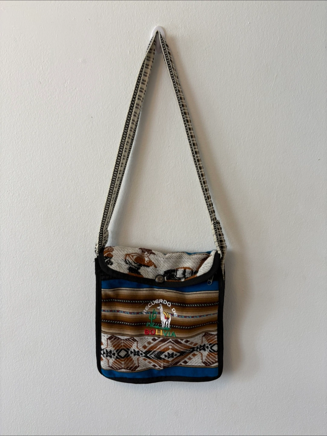 A cotten woven crossbody bag, perfect for carrying your essentials. It features a flap with a button closure. The pattern shows a colourful design with an image of a llama.