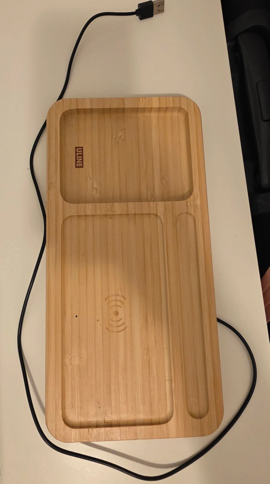 Wooden tray. Features a wireless charging pad. Has a USB cable. The tray is perfect to organize your items on your desk or nightstand, and it can create a peaceful, tidy space.