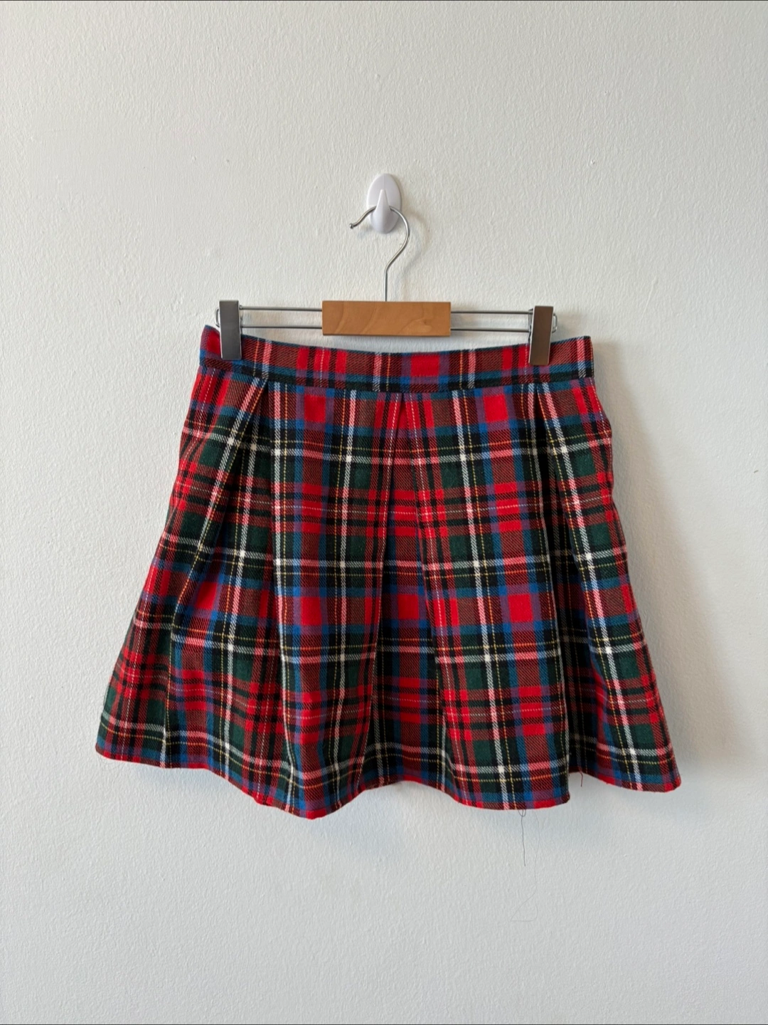 Super cute plaid skirt, perfect for a casual look. Features a pleated design. Red, green, blue, and white checkered pattern.
