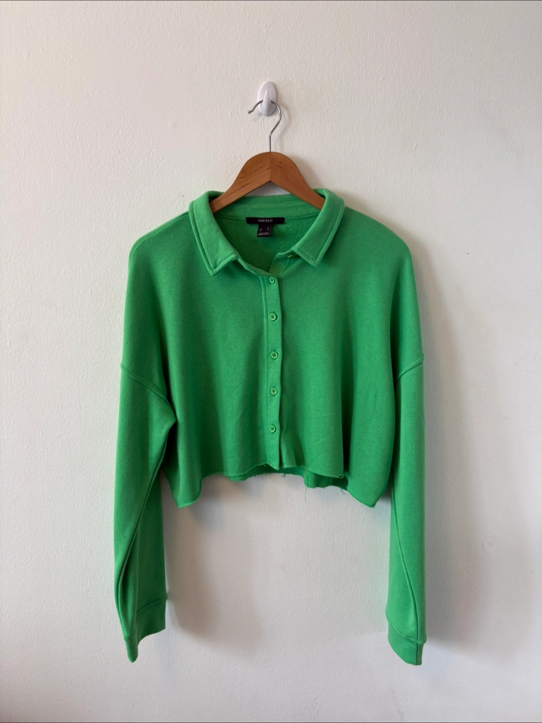 A bright green sweater, with a collared neckline. Features long sleeves, and button closure. Comfy and reliable during winter months