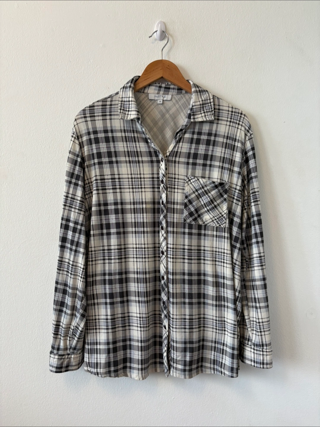 Long-sleeved plaid shirt. Button-up style with a breast pocket.