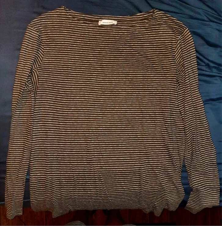 Brown and white striped long-sleeved shirt. Features a round neck. Perfect to wear on a cold day.