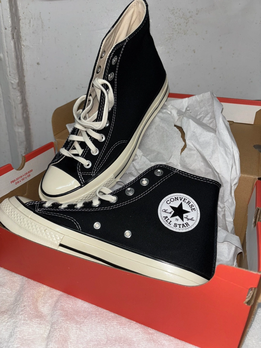 Black canvas high top sneakers. White laces. Cream colored soles. They come with the original box. A great everyday pair of shoes to have on hand.