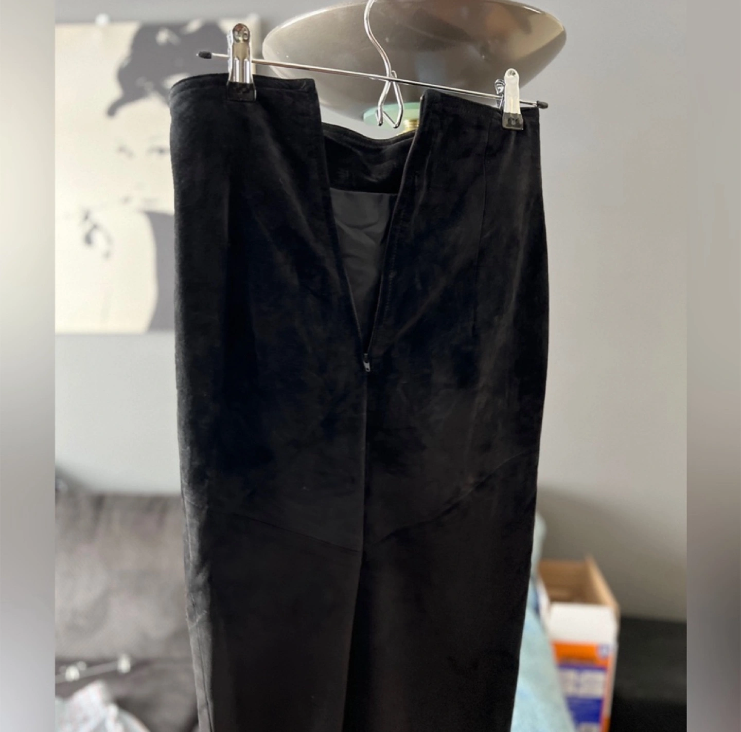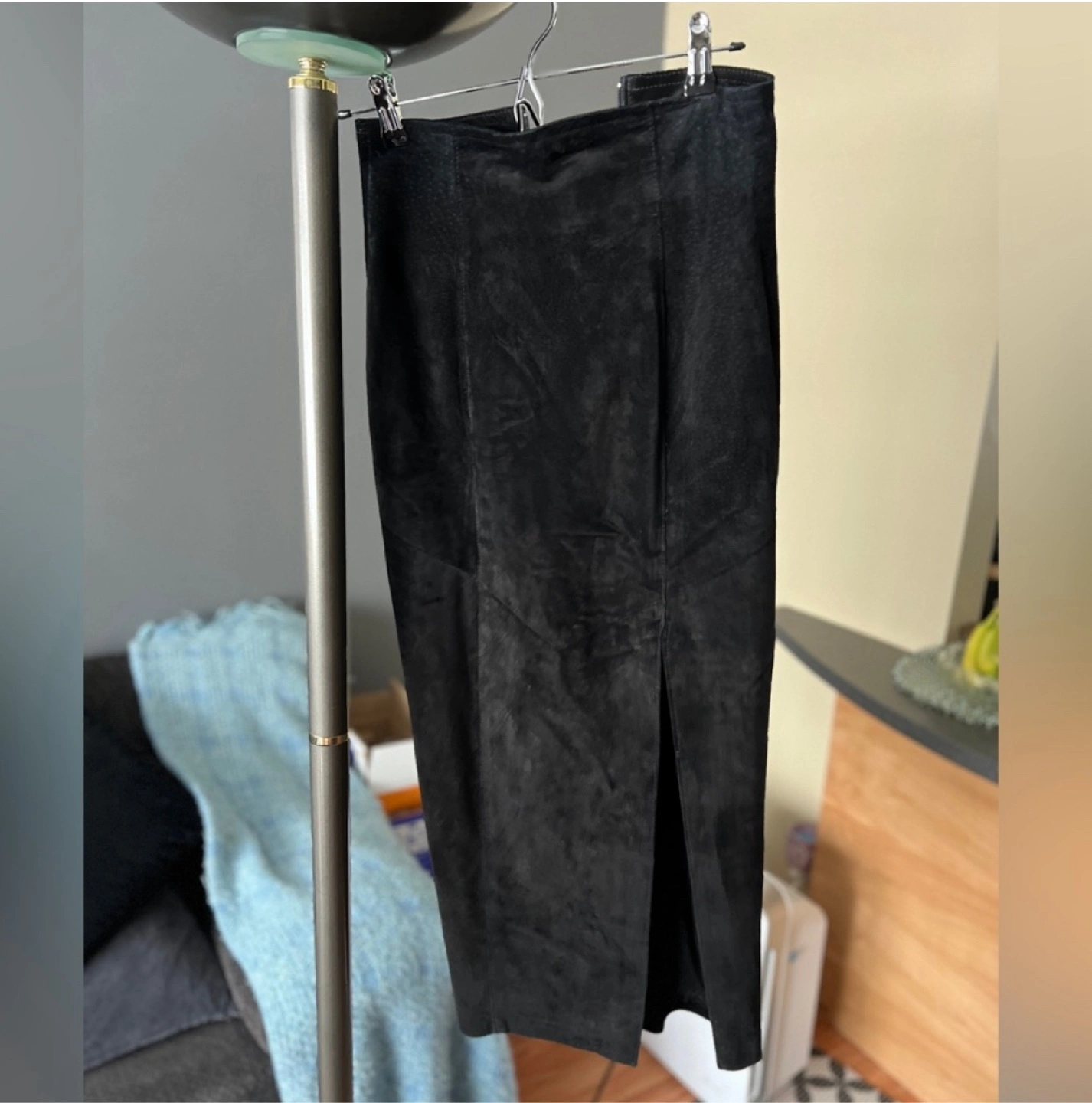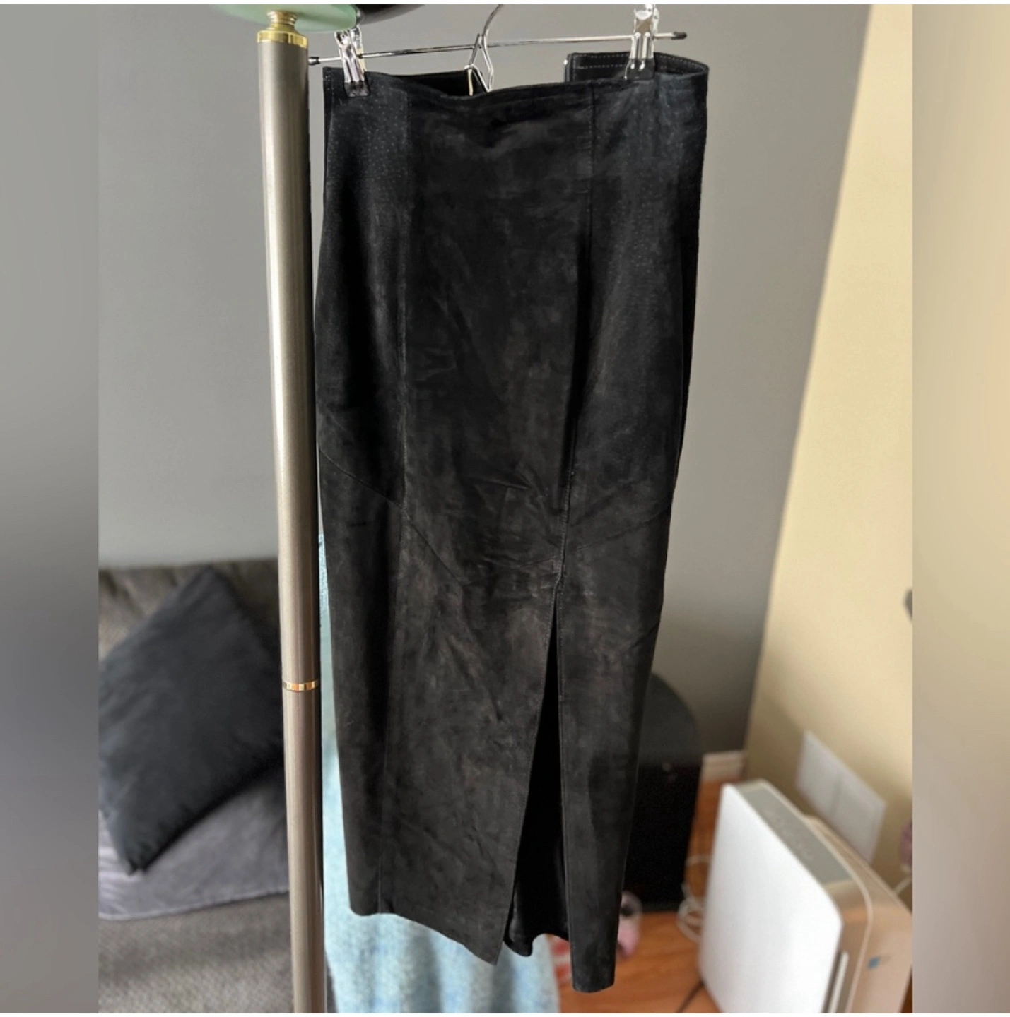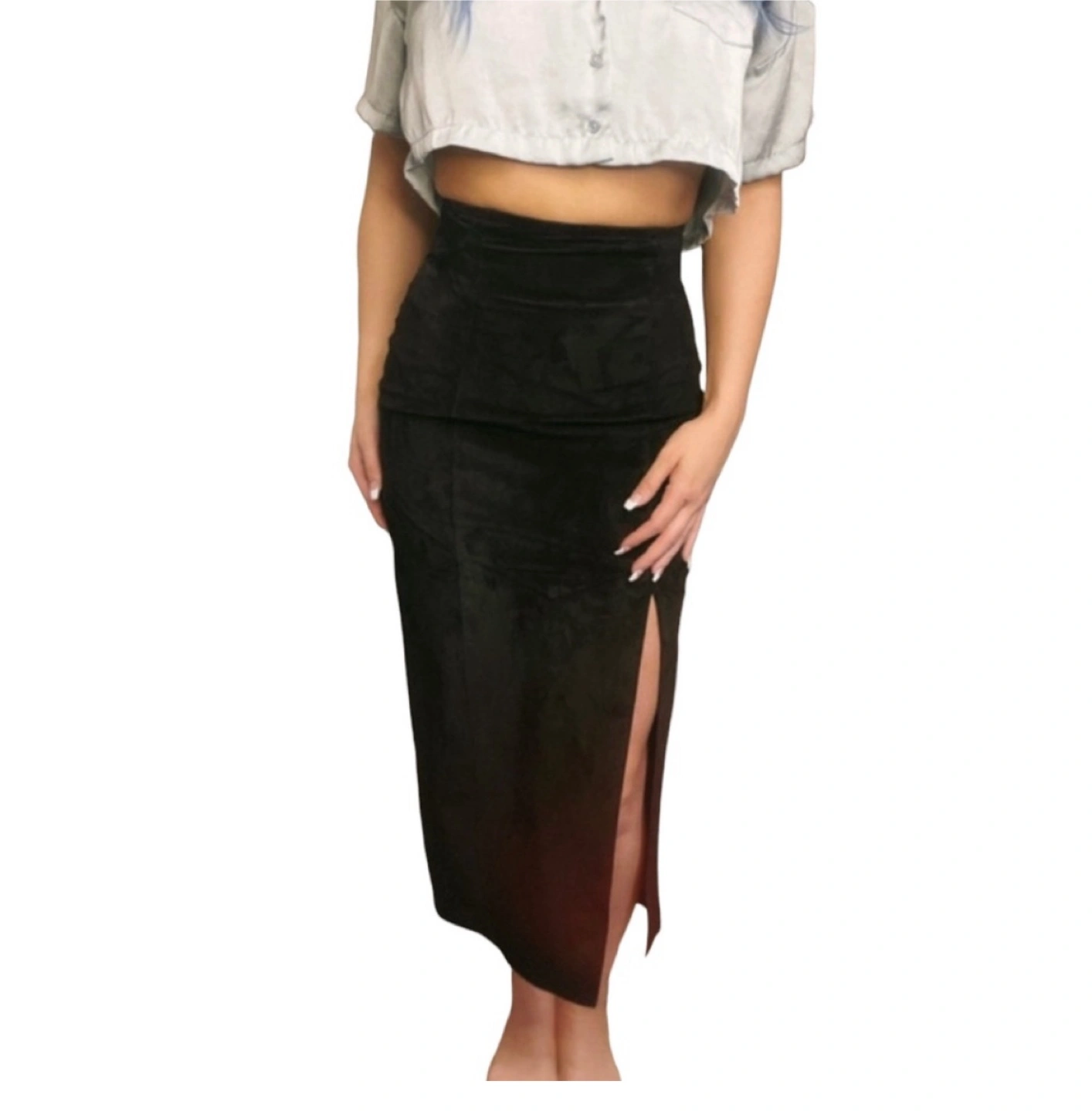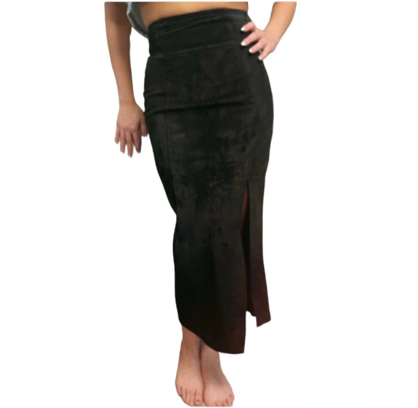 Midi-length, black suede skirt . Has a high-waist with a slit. A very comfortable and stylish choice for any wardrobe. Size 2. Perfect condition